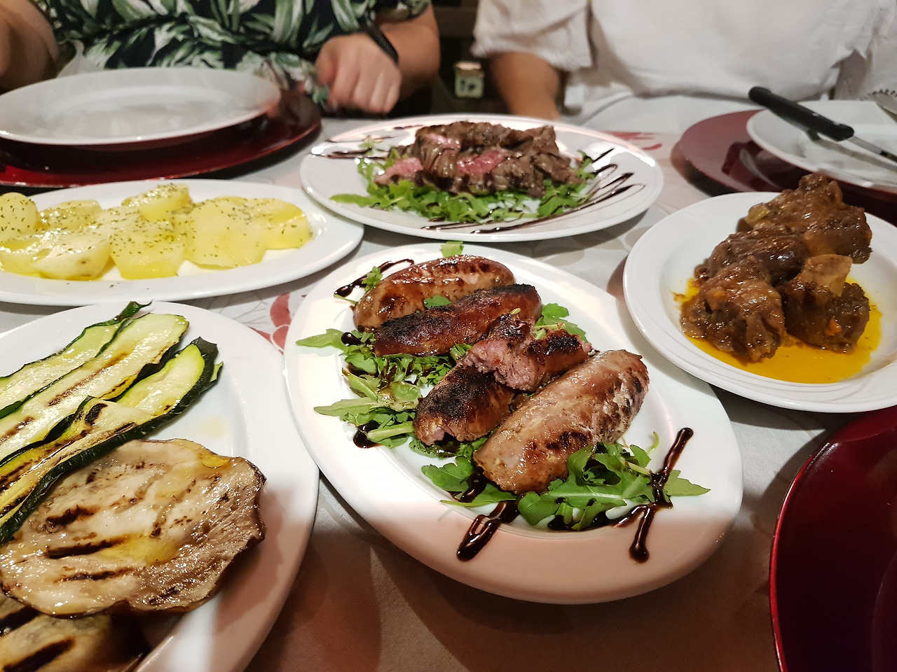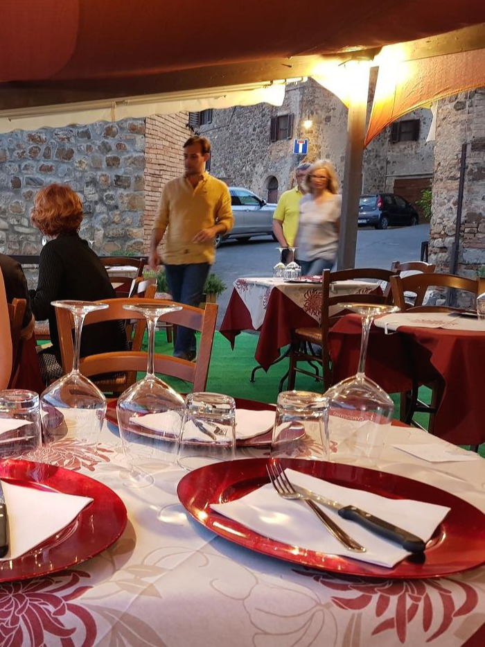 테이블은 절벽 한편에 야외의 천막 아래 테라스처럼 차려져 있고, 절벽 쪽으로는 절경이라고 하기엔 평범해 보이지만, 여기가 토스카나임을 증명하는 듯한 어두운 저녁의 짙푸른 녹색의 언덕들이 펼쳐져 있다.