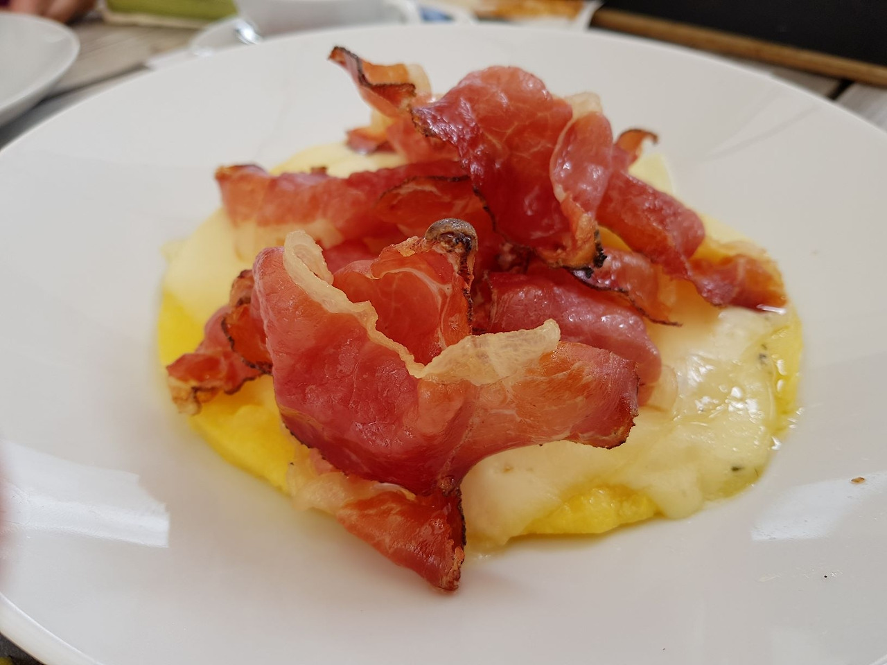 치즈와 햄을 올린 이 동네 음식 "폴렌타"