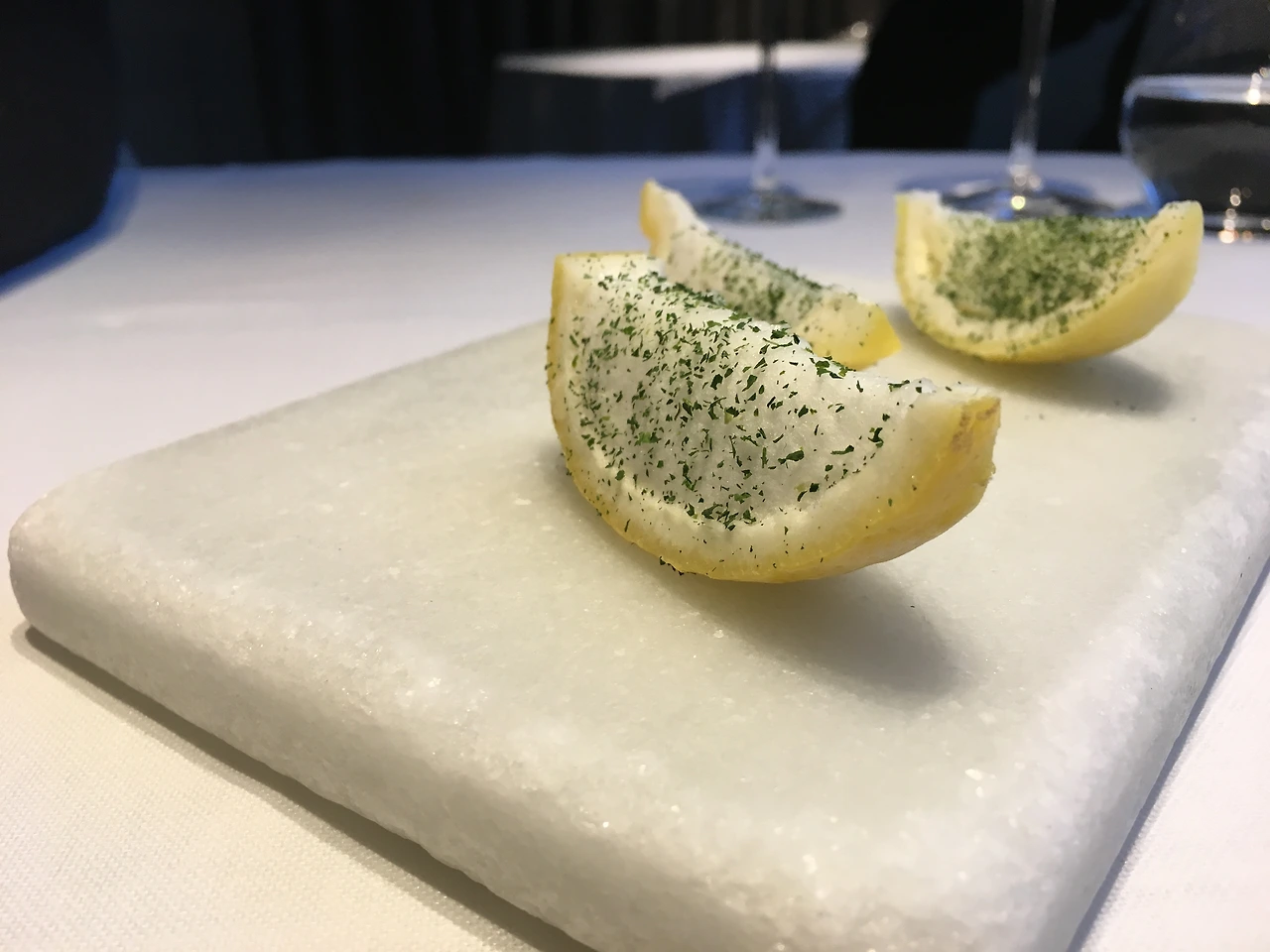 망고, 레몬 그리고 주니퍼의 구슬 아이스크림. 상대적으로 엄청 평범한 음식이네.