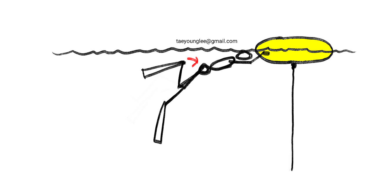물에 익숙하지 않은 사람들이 허리를 펴고 머리를 들려는 경향이 있는데, 그럴수록 하체는 가라앉습니다. 허리는 오히려 구부정하게, 머리는 스노클에 물이 들어오지 않을 정도로만 물속에 잠기게 하는 것이 좋습니다.