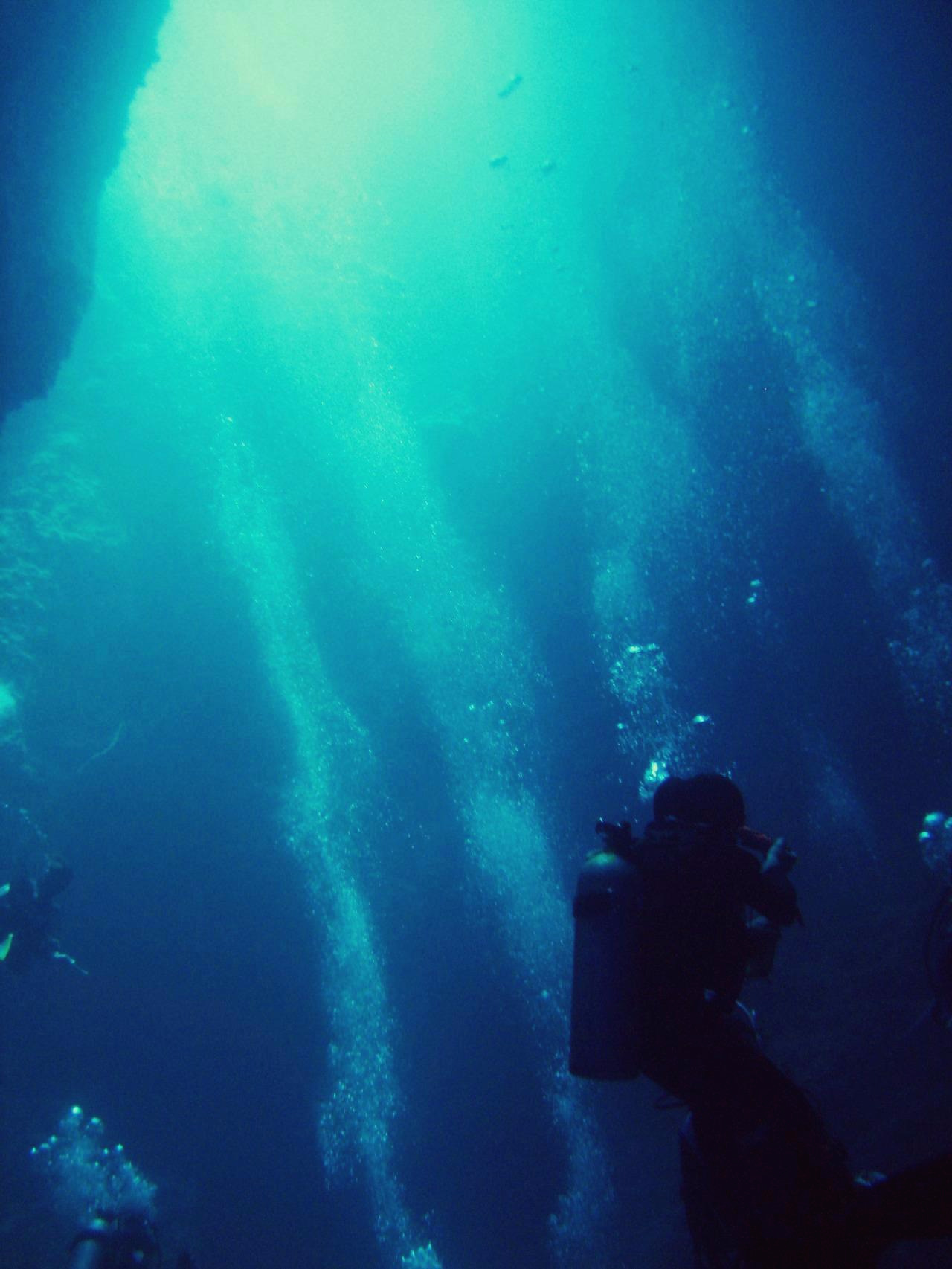 그렇게 얼마 정도 내려가니 넓은 공간이 나왔다. 그리고 내가 내려온 곳을 돌아보니, 다이버들이 햇살을 배경으로 한가득 버블을 뿜으며 줄지어 내려오고 있었다.