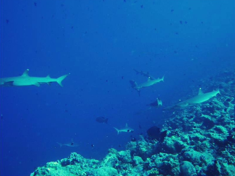 블루코너를 뒤덮고 있는 상어들. 지느러미 끝이 하얘서 이름이 White Tip Reef Shark