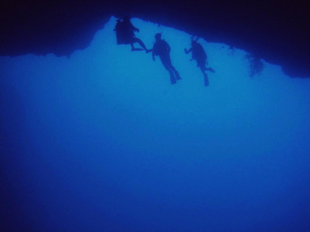 블루홀의 커다란 홀에서 옆에 뚫린 벽을 보고 있으니 많은 그림자 다이버들이 오고 간다. 숨 쉬는 소리가 계속 귓전을 때리고는 있었지만, 그림자뿐인 그 풍경은 "고요"했다.