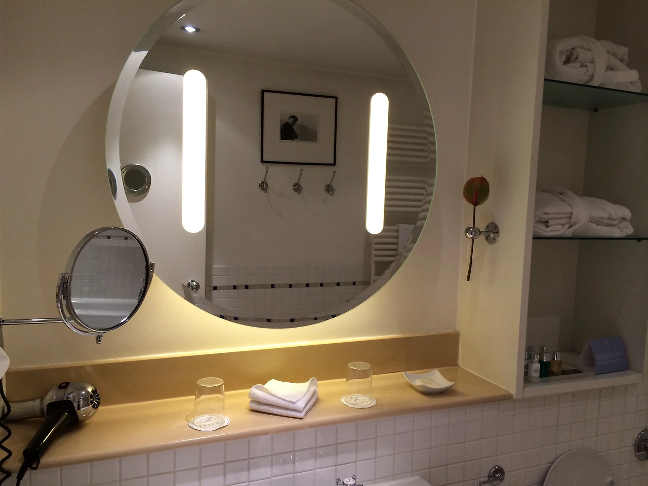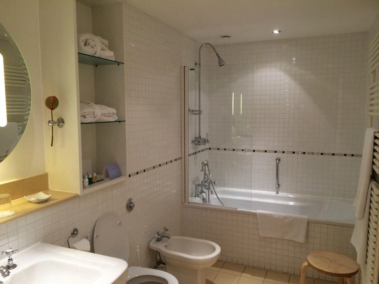 뭔가 수상(?)한 느낌이 들어 방구석 구석을 다 살펴봤다. 방에 깔리는 배경음악은 책상 위의 아이맥에서 나오는 음악이었다. TV를 켜 볼까 싶어 들었던 리모컨이 지나치게 무거워 봤더니 뱅앤올룹슨이잖아? 뭔 호텔방 TV가 뱅앤올룹슨이람? 간결해 보이는 스탠드 조명도 범상치 않아 보이고, 욕실의 어메니티도 향이 고급지다. 어디 거야? 하고 봤더니 몰튼브라운. '처음 보는 브랜드인데?'라고 생각했더니 몇 년 후에야 우리나라에 명품 프리미엄을 붙이고 들어오더라. 브랜드를 알 수는 없지만 샤워기를 감싼 은은한 옥빛도 분명 평범한 제품은 아니라는 걸 보여주는 것 같다.
