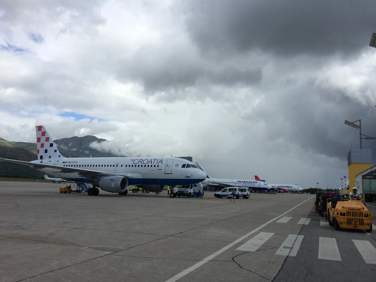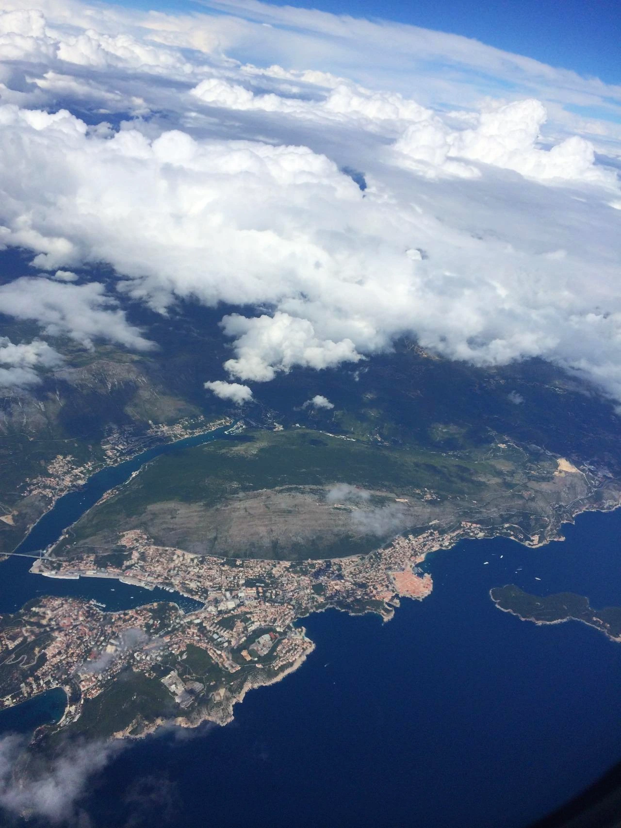 이륙 직후 내려다 보이는 두브로브닉의 전경. 오렌지색 지붕이 빼곡한 곳이 구시가지임을 어렵지 않게 찾을 수 있다.