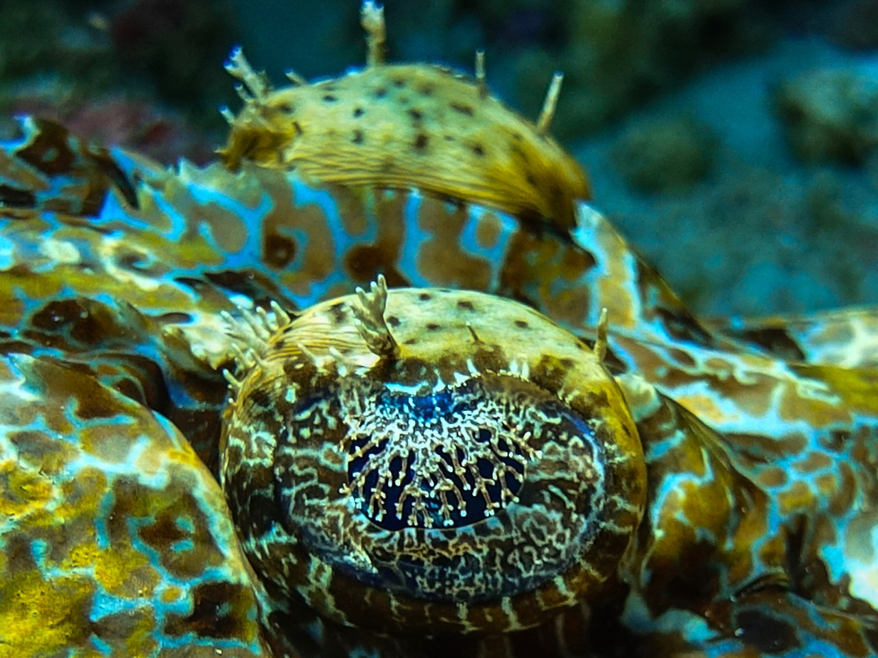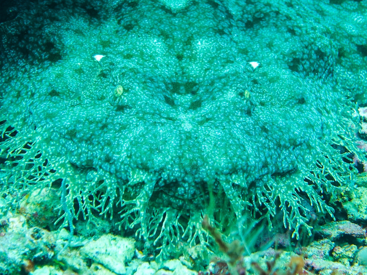 Wobbegong shark의 옆모습. 저 세로로 까만 눈은 깜빡이긴 하는 걸까?