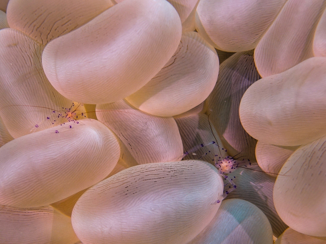 Bubble coral 사이를 보면 투명하면서도 보라색 점들이 예쁜 작은 새우들이 많다.