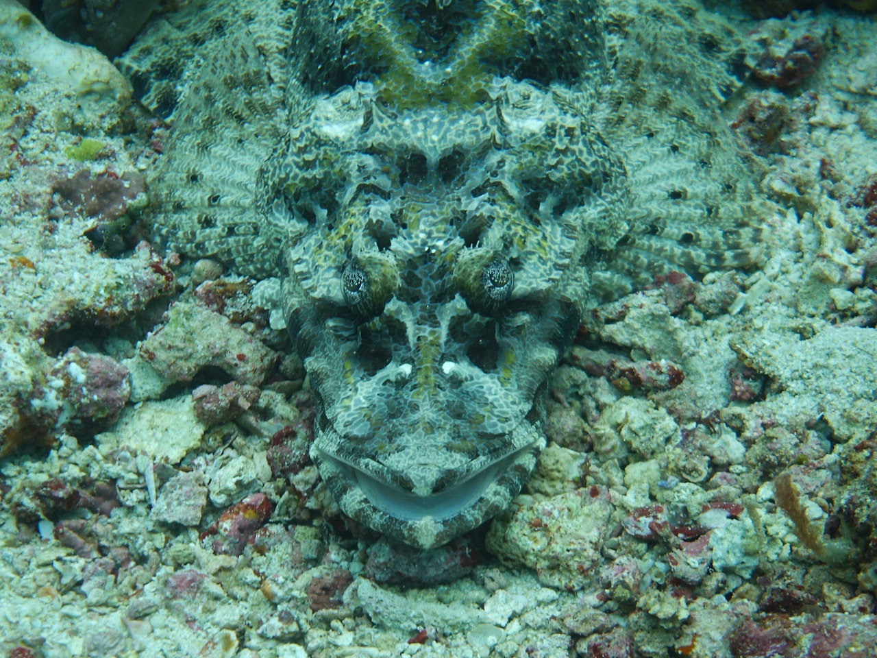 Crocodile fish의 증명사진. 쉬고 있는 걸 방해하지 않으려 조명을 안 켰더니 배경이랑 구분하기도 어렵군.