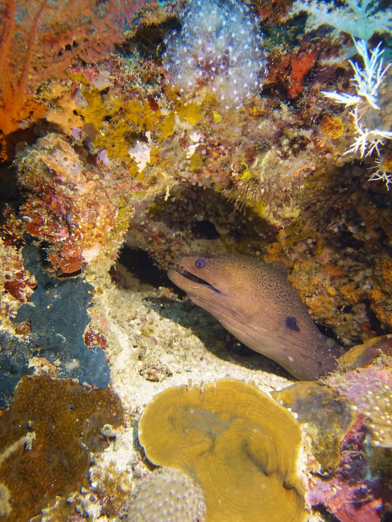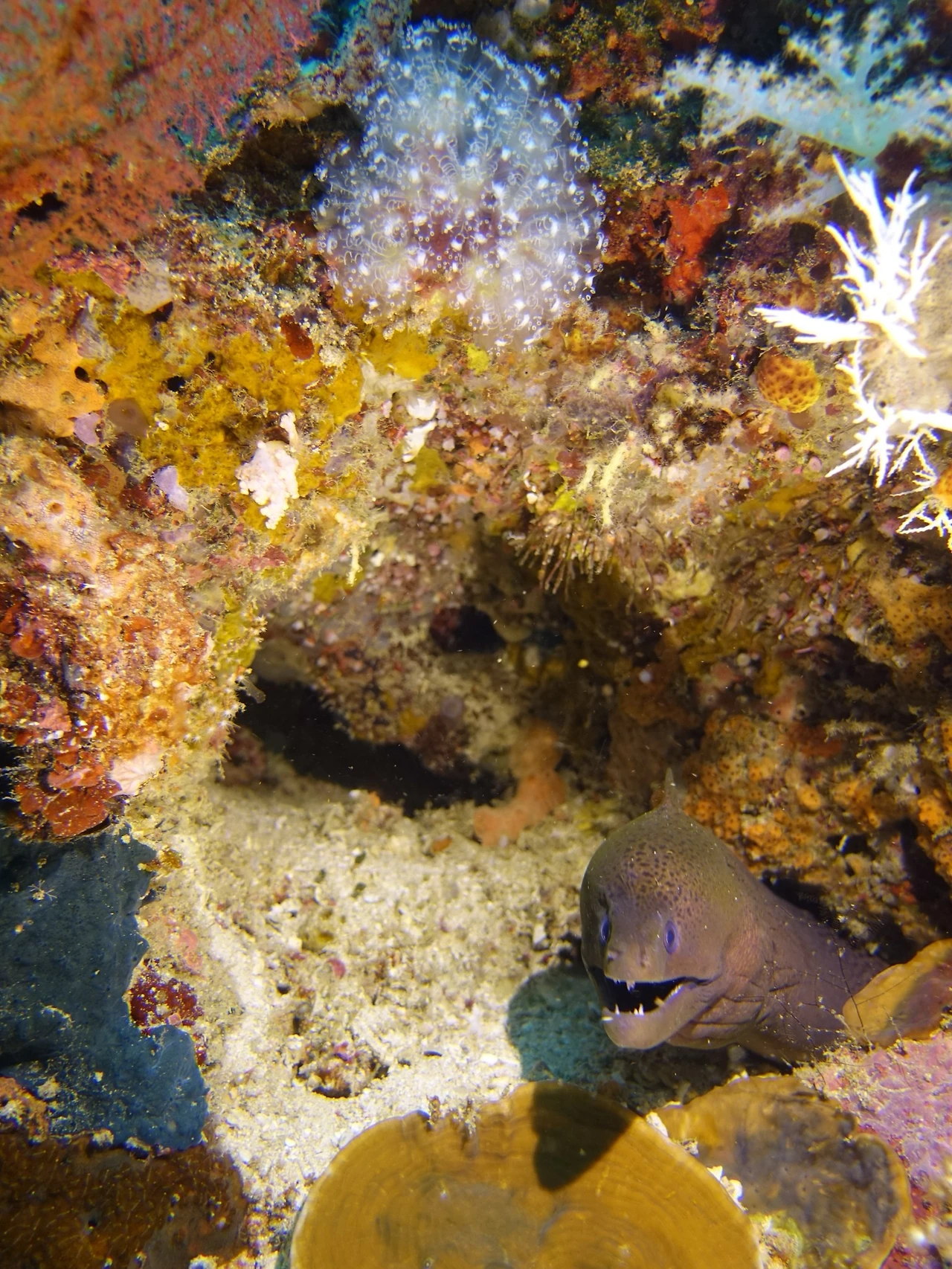 곰치는 실제 다이빙 중에도 종종 볼 수 있는 녀석인데, 게임에서처럼 굴에 숨은 체로 머리만 내밀고는 흐늘흐늘 움직이는 모습을 보는 게 보통이다. 그렇게 있을 때는 거의 입을 벌리고 있는데, 이건 숨쉬기 위해 그러고 있는 것이다. 그래서 입안을 관찰할 수도 있는데, 입천장의 중앙에도 한 줄로 이빨이 날카롭게 솟아난 것을 볼 수가 있어, 얼마나 위험한 포식자인지 가늠할 수 있다.