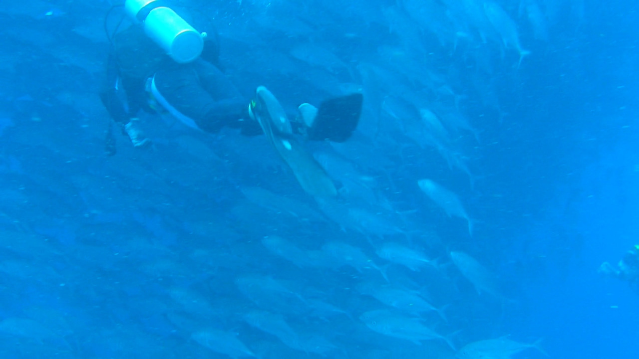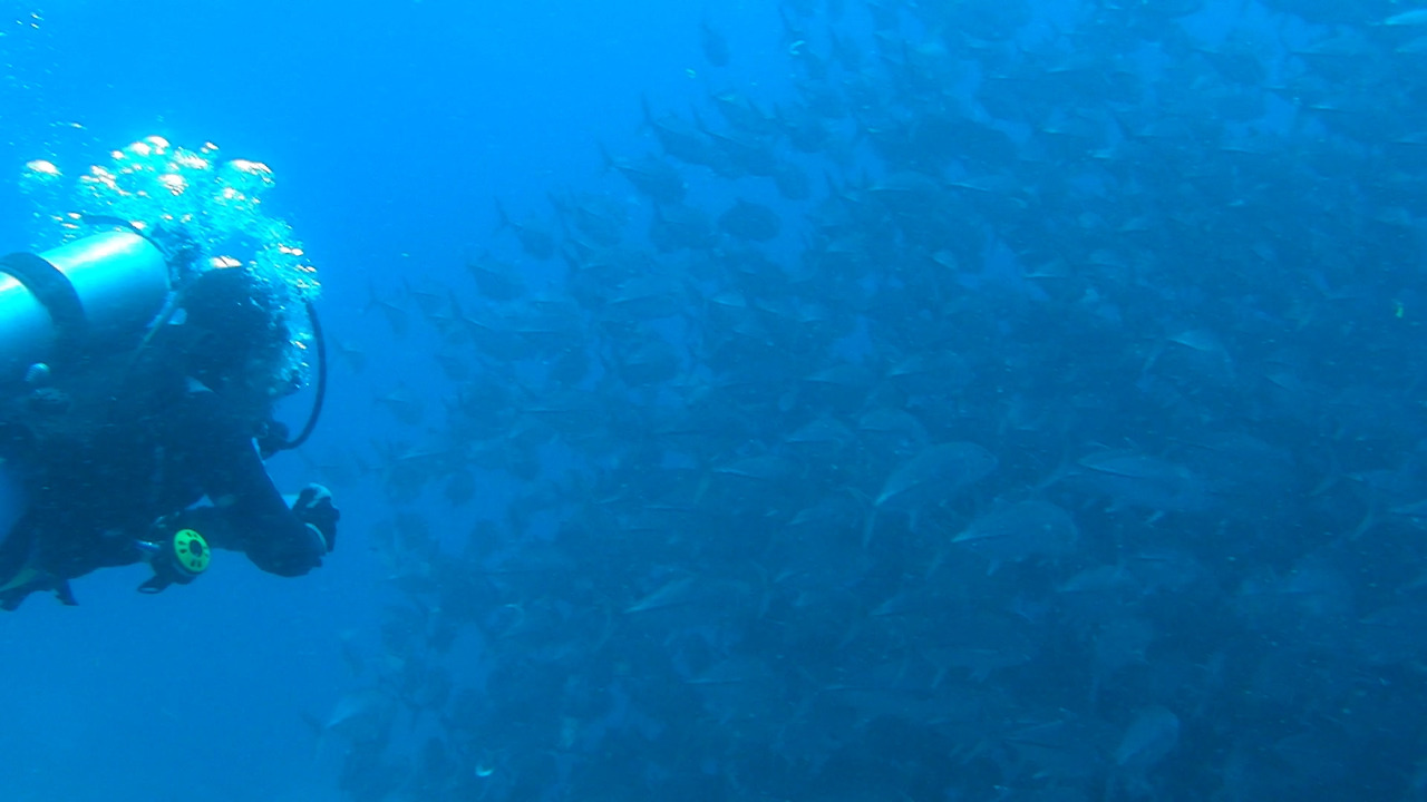 나의 눈도, 카메라의 렌즈도 머물 곳을 모르고 사방을 휘저었다. 폭포수 마냥 Jackfish의 행렬이 내 발 밑에서 세차게 지나가고 있는가 싶더니 이내 돌아가는 행렬은 내 어깨 위를 스치며 빠르게 지나간다. 만약 이들이 나에게 해라도 끼칠지 모른다고 생각했다면 극한의 공포를 느꼈을지도 모르겠으나, 그러리라고는 추호도 생각지 않았기 때문에 놀라움만으로 그 순간을 즐기고 있었다.