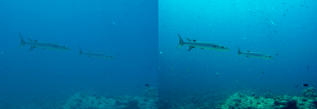 초보자로서 간편한 장비로 수중에서 찍은 사진은 대체적으로 푸른빛을 띠게 됩니다. 카메라에 수중 사진 모드가 있는 경우도 있고, 고프로 같은 액션캠에는 수중 필터가 있기도 하지만, 그런 것이 없는 경우에는 사후 보정을 하면 사진이 좀 더 보기 좋아집니다. 책이나 인터넷을 통해 보정하는 방법을 익히면 사진을 더 근사하게 만들 수 있습니다.