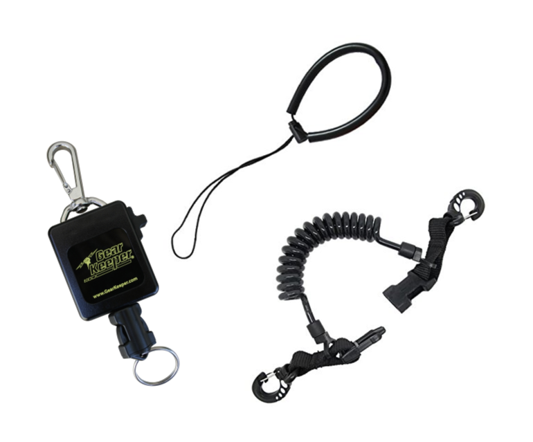 카메라나 다른 장비를 고정하기 위한 장비들. 왼쪽부터 각각 리트랙터(Retractor), 랜야드(Lanyard), 퀵코일(Quickcoil)로 불린다.