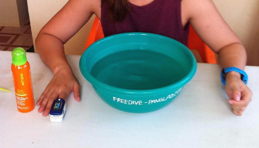 물속에 들어갔을 때 자동적으로 반응하는 우리 몸의 변화를 눈으로 확인하는 시간을 가졌다. 얼굴을 물속에 담그면 심장박동이 느려져 숨을 더 오래 참을 수 있다나? 바로 실험에 들어갔다. 손가락에 맥박 측정기를 끼우고 얼굴을 물에 담갔을 때 어떻게 변하는지 보는 거다. 먼저 나부터. 내가 얼마나 물을 좋아하는지 보라지.