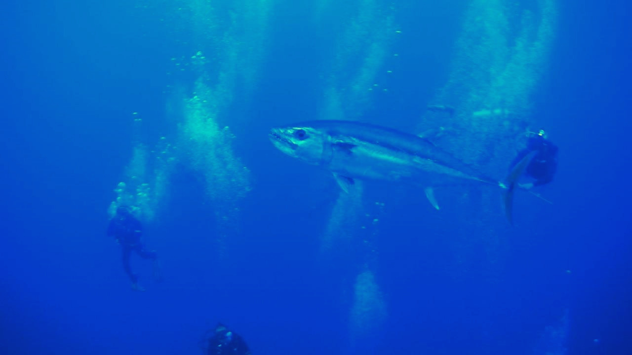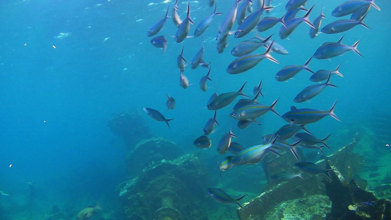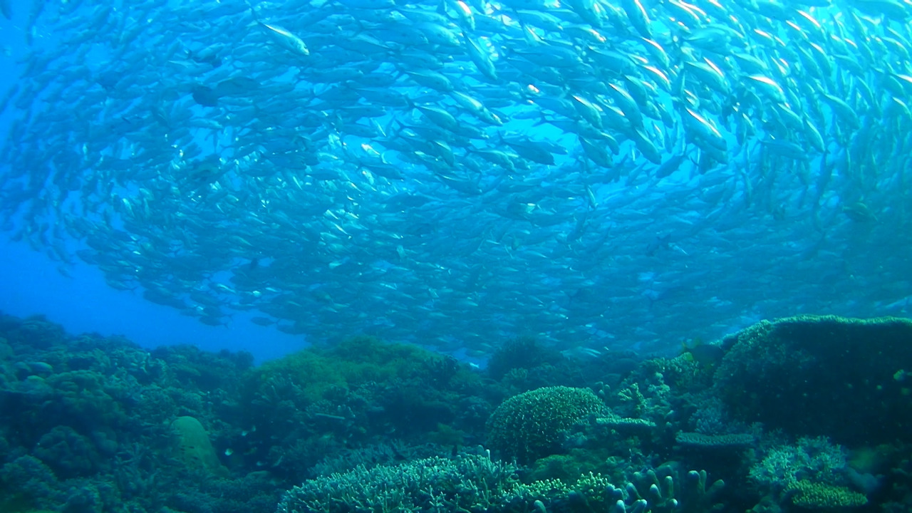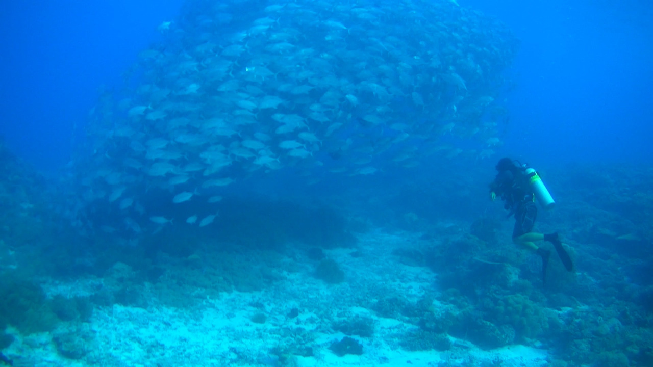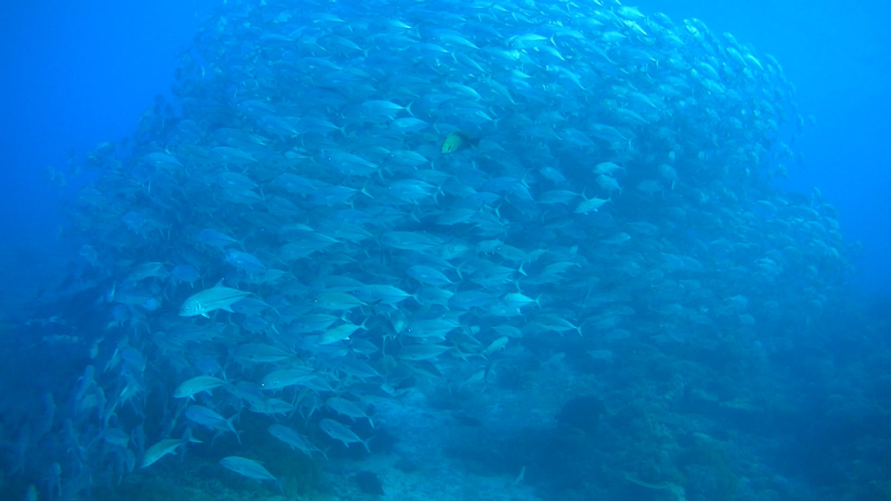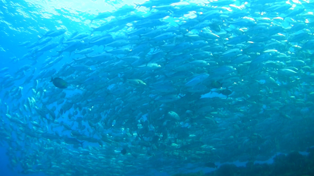 Jackfish (Bigeye Trevally)의 소용돌이. 이 밑에 들어가서 보면 어마어마한 장관이다.
