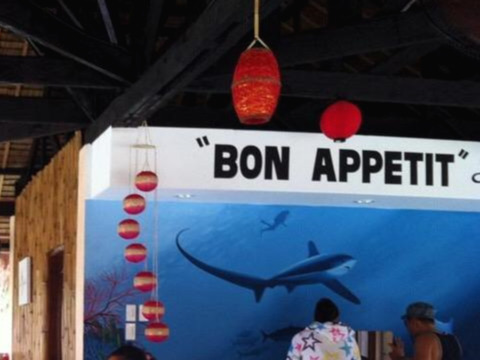 이곳 말라파스쿠아 섬은 "환도상어 (Thresher Shark)"를 보는 곳으로 유명하다고 한다. 하지만 이때까지는 아직 우리나라 사람들에게는 거의 알려지지 않은 곳이라, 이렇게 자신있게 처음 와 보는 곳이라 했던 것. 그러면 그 환도상어라는 것은 어떤 생물인 걸까? 남들보다는 그래도 상어라는 생물에 관심을 가지고 있다고 생각했건만, 환도상어라는 이름은 생전 처음 들어보는 것이니, 궁금증이 폭발했다. "쟤가 바로 환도상어예요." Angela 강사님이 손으로 가리킨 곳은 리조트 식당 벽에 크게 그려진 바닷속 풍경이었다. 거기에 과연 이 섬의 자랑거리인 만큼 주인공처럼 가장 크게 그려져 있었다. 응? 하지만 이게 뭐야? 다른 생물들은 그래도 꽤나 그럴싸하게 잘 그려져 있는데, 왜 주인공인 환도상어는 이렇게 이상하게 그려져 있는 거지? 귀엽게 그리려고 한 거라 생각하기에도 다른 생물들과는 괴리가 느껴지고, 백번 양보해서 귀엽게 그리려 한 거라 생각해도 썩 귀여운 모습이라기엔 동의하기 어려운 얼굴인데?