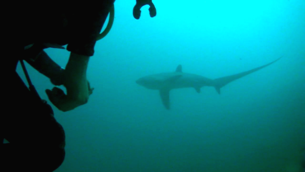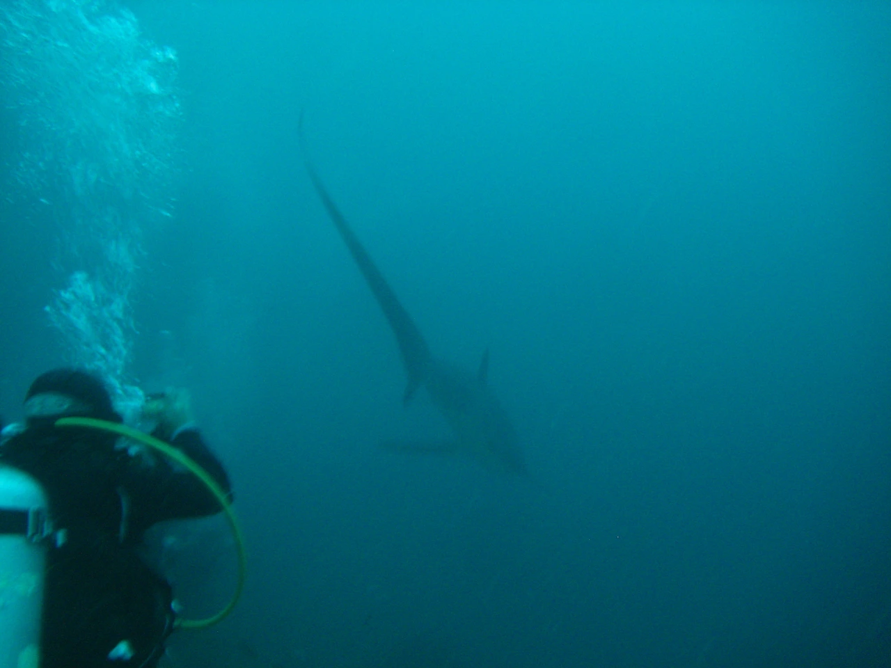 그러던 가운데 앞쪽에 있던 사람들이 손을 뻗어 뭔가를 가리킨다. 음? 뭐가 나온 모양이지? 하지만 시야가 좋지 않아 뒤쪽에선 보이는 게 없다. 앞사람들의 손짓은 계속되었다. 분명 뭔가 나오긴 나왔나 보다. 앗?! 내 눈에도 뭔가 길쭉하고 날렵한 것이 스쳐 보인 것 같다. 그러더니 큰 그림자가 우리 주위를 한 바퀴 도는 것이 보였다. 저것이 환도상어? 여기 오기 전까지는 들어본 적도 없던 생물이 눈 앞에 나타났다는 사실에 잘 보이지도 않는데도 묘한 긴장감과 함께 성취감이 느껴졌다. 이왕이면 좀 더 가까이 와 주련. 그렇게 조마조마 기다린 끝에, 그 녀석이 우리에게 다가왔다! 오! 이것이 바로 그 환도상어!! 아니?! 얼굴 생김새가 리조트 벽에 그려져 있던 그 귀여운 얼굴 그대로잖아? 내가 이상하게 생각했던 그 그림이 사실은 실사 수준이었다는 걸 알게 되었다. 그 커다란 눈에 소심하게 벌린 입의 표정을 보니 수줍음을 많이 탄다는 게 묘하게 어울리는 구석이 있어 보였다. 하지만 환도상어의 진가는 얼굴보다 꼬리에 있다. "환도상어"라는 이름에서도 예상이 되고, 또 인터넷에서 찾아본 사진에서도 긴 꼬리의 모습을 볼 수 있었지만, 눈 앞에서 직접 보는 느낌은 그것과는 완전히 달랐다. 몸길이의 절반을 차지하는 긴 꼬리는 마치 리듬체조의 리본처럼 큰 물결을 그리며 잔상을 남기듯 너울거렸다.