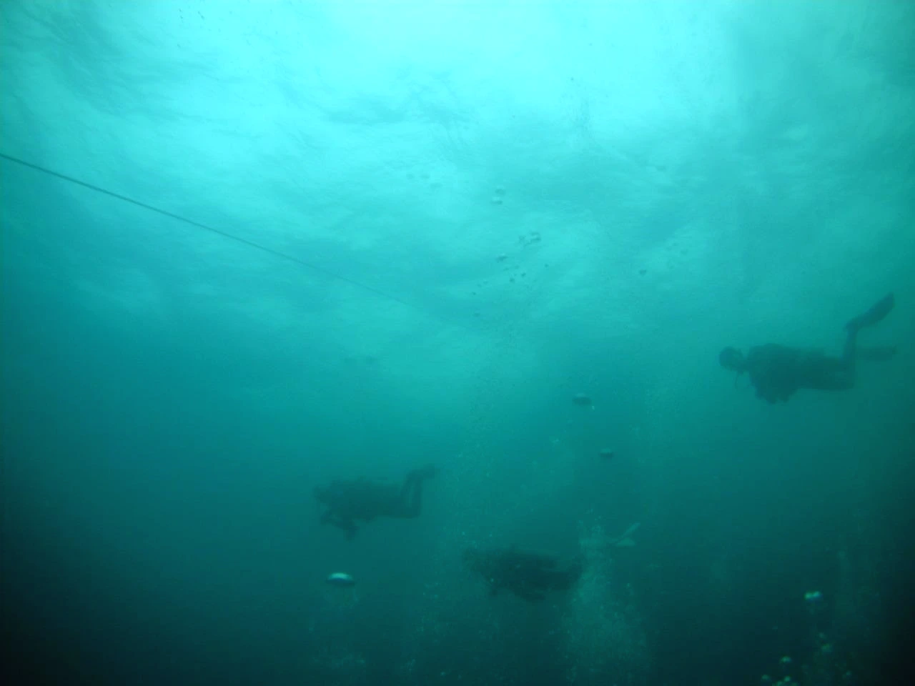 우리가 입수해서 내려가면서 보니, 이미 먼저 와서 자리 잡고 있는 다이버들이 내뿜는 공기방울들이 눈 앞을 가릴 지경이다. 우리도 바닥에 자리를 잡으려니 빈 틈이 안 보인다. 도대체 어디가 좋은 자리일지.