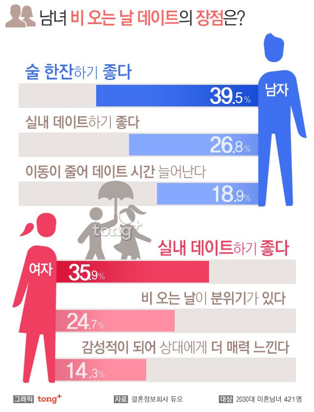 비 오는 날 데이트의 장점으로 남자는 '술 한잔하기 좋다(39.5%)'를, 여자는 '실내 데이트 하기 좋다(35.9%)'를 가장 많이 꼽았다. 이어 남자는 '실내 데이트 하기 좋다(26.8%)', '이동이 줄어들어 데이트 시간이 늘어난다(18.9%)', 여자는 '비 오는 날이 분위기가 있다(24.7%)', '감성적이 되어 상대에게 더 매력 느낀다(14.3%)' 순이었다.