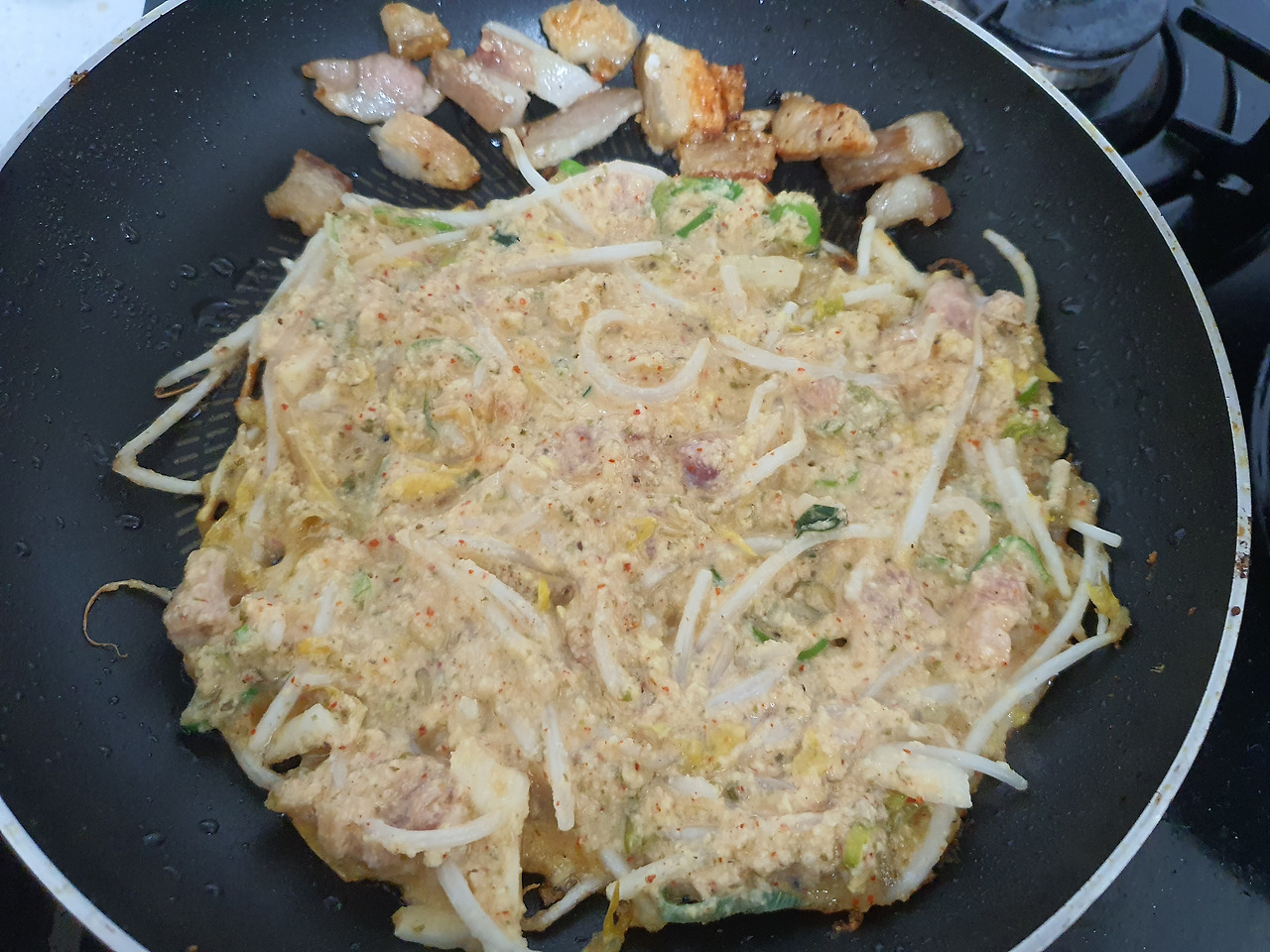 우리 집 빈대떡은 돼지비계를 달군 웍에서 기름을 빼서 그 기름으로 프라이팬에 간 녹두에, 익은 김치 쫑쫑 썰어, 돼지고기와 생숙주를 넣은 뒤에 반죽을 만들어 한 국자씩 떠 넣어 굽는다. 생숙주는 식감이 좋아 반드시 넣는다. 돼지기름은 일반 식용유보다 고소하고 감칠맛이 느껴져서인지 가족들이 좋아한다. 기름을 다 빼고 난 돼지비계도 빈대떡과 접시에 담아 주는데 그 맛이 또한 일품이라고 잘 먹는다. 바삭거리는 과자처럼 고소함 때문인지 사위는