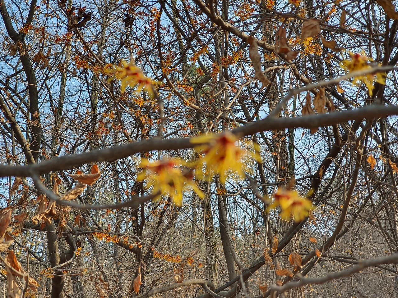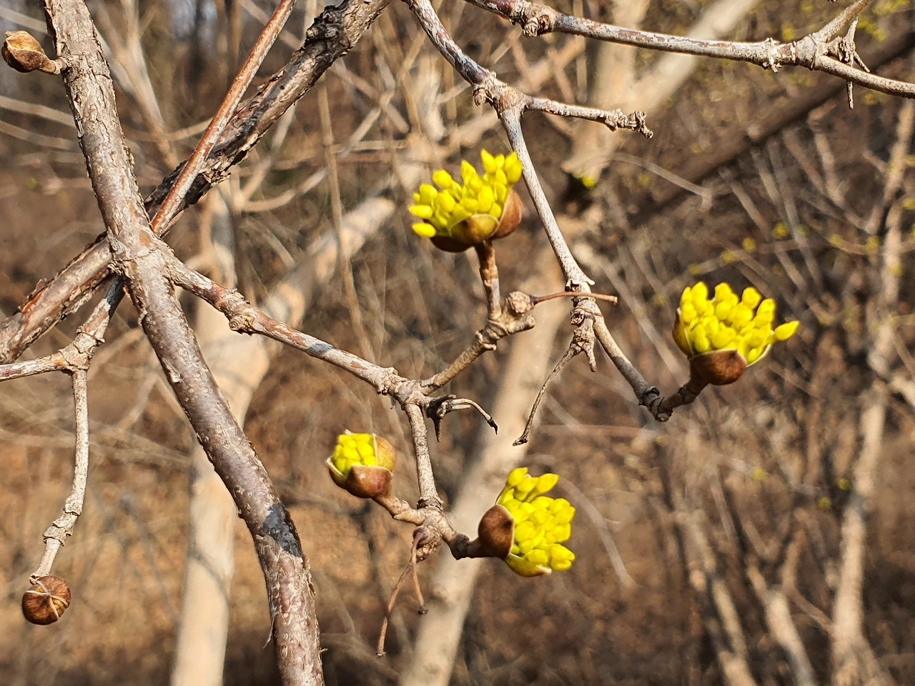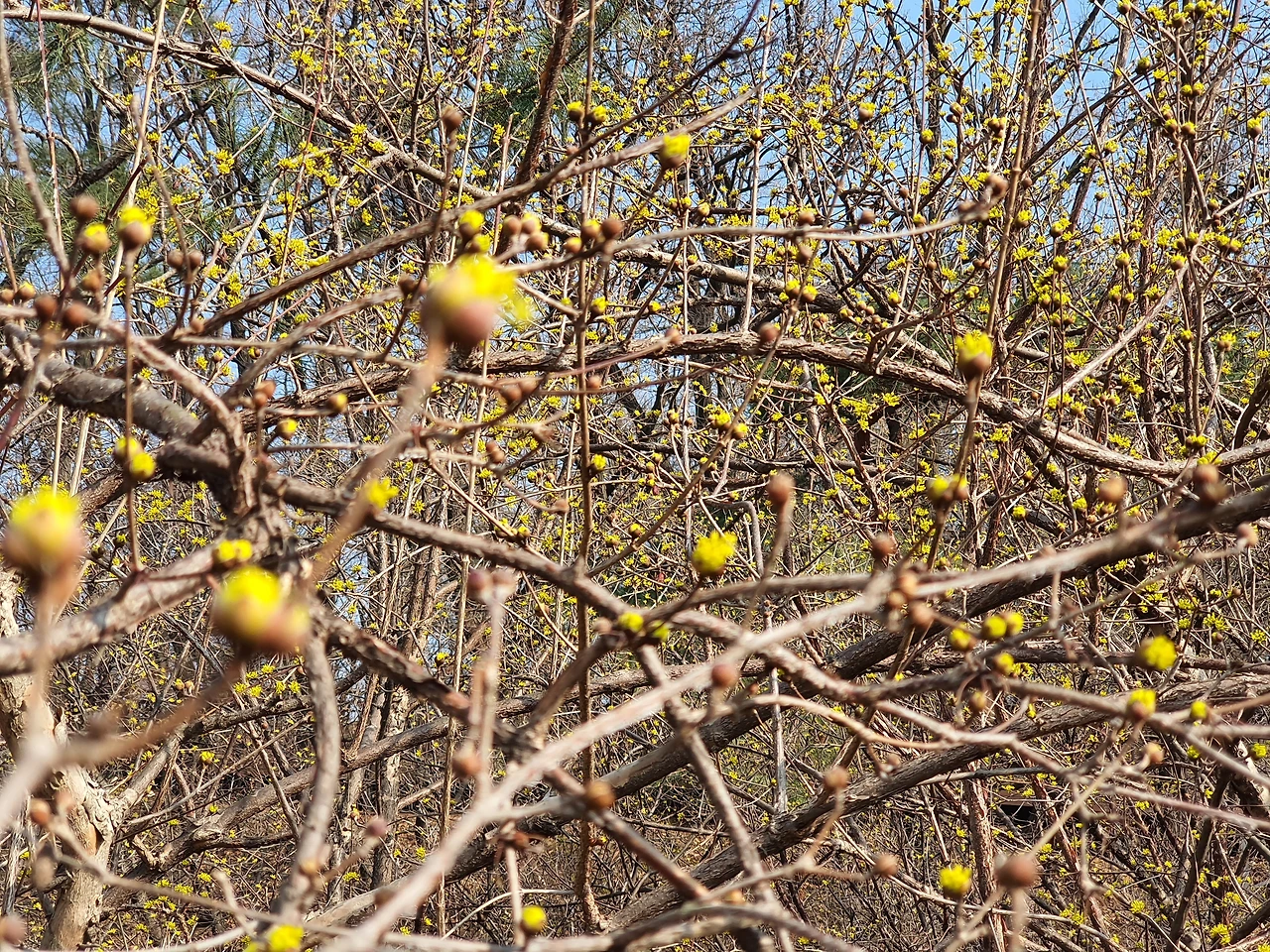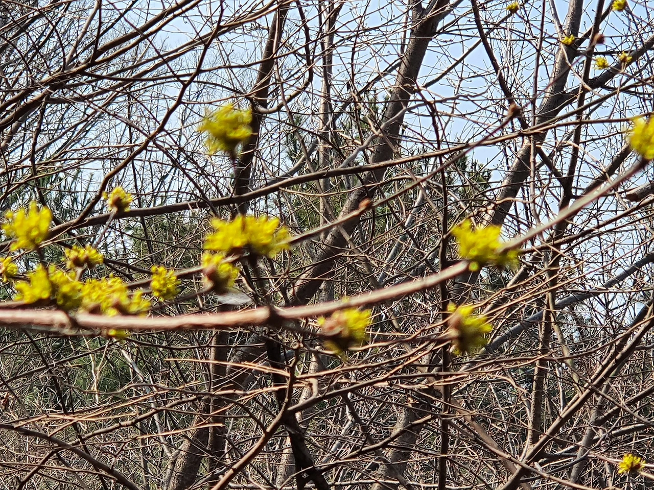 포근한 날씨지만 아직도 겨울빛에서 벗어나지 못한 숲 속에 노란 산수유가 먼 데서 찾아온 나그네를 위로해 줍니다.