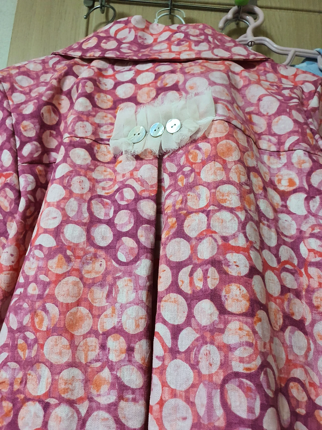 그리하여 처음부터 다시 소매를 소매 구멍에 잘 맞춰서 재봉을 했다. 겨우 맞추고 나머지 카라를 맞춰 재봉하고 나니 거의 완성이 된 듯하다.