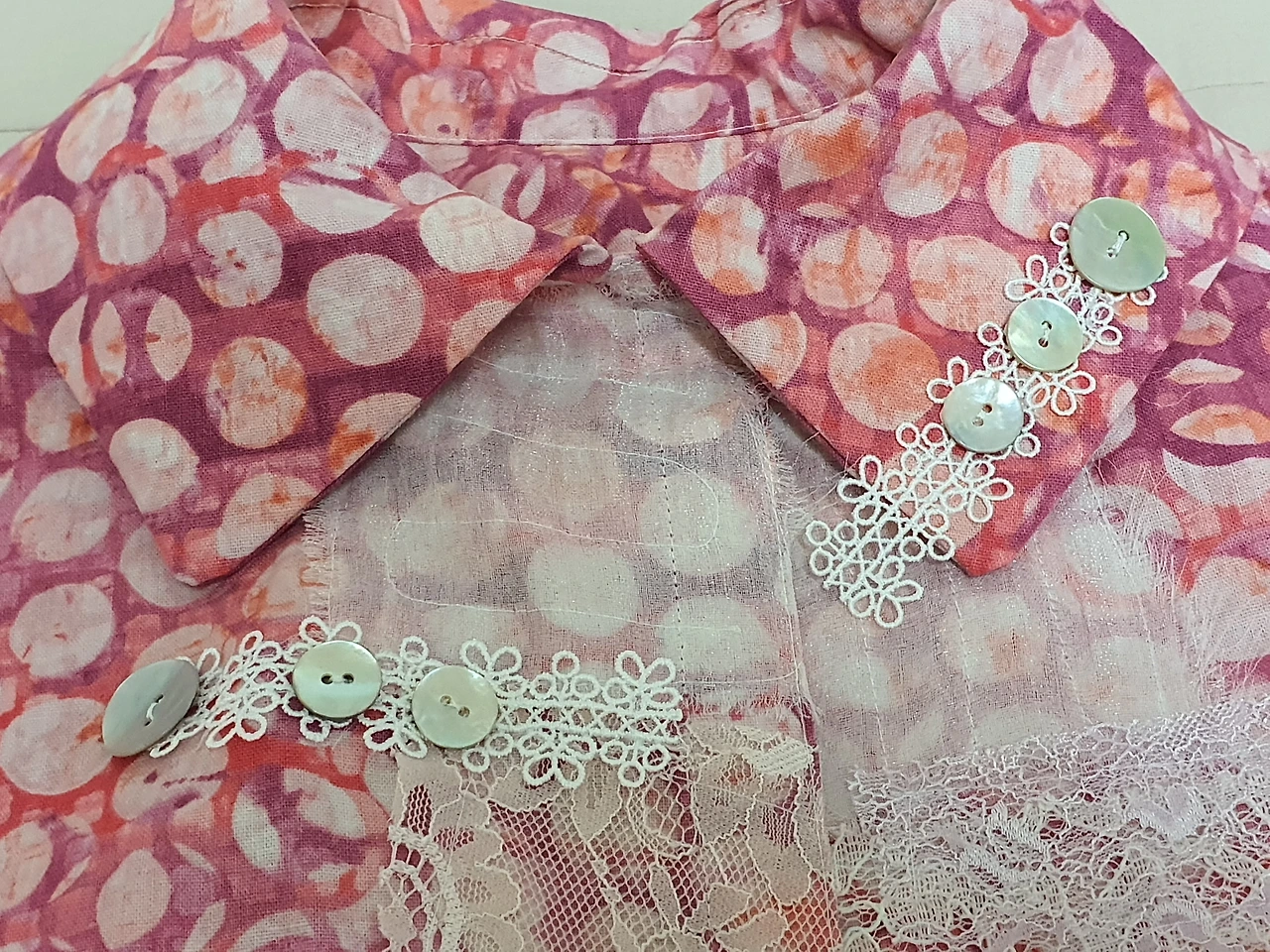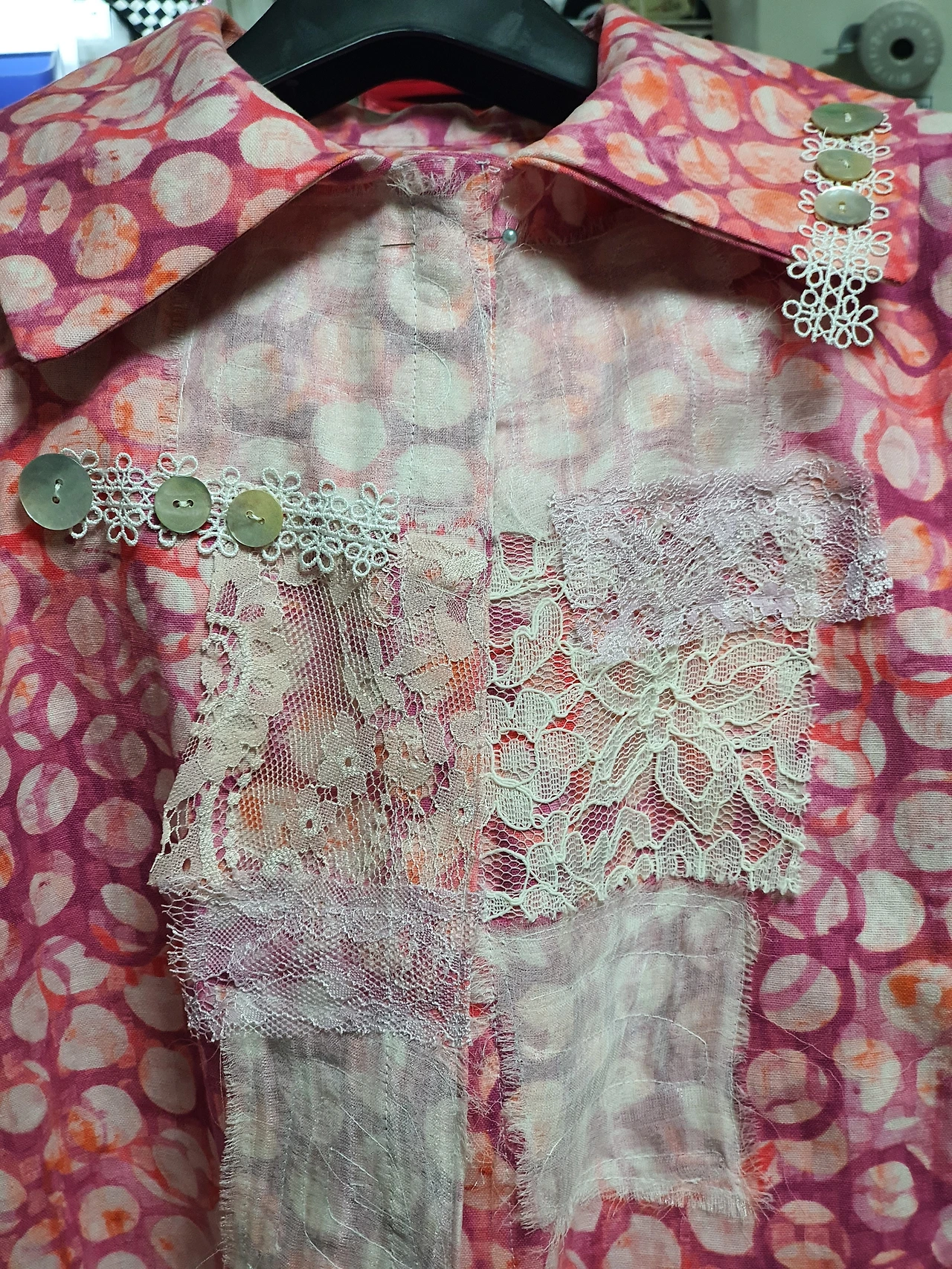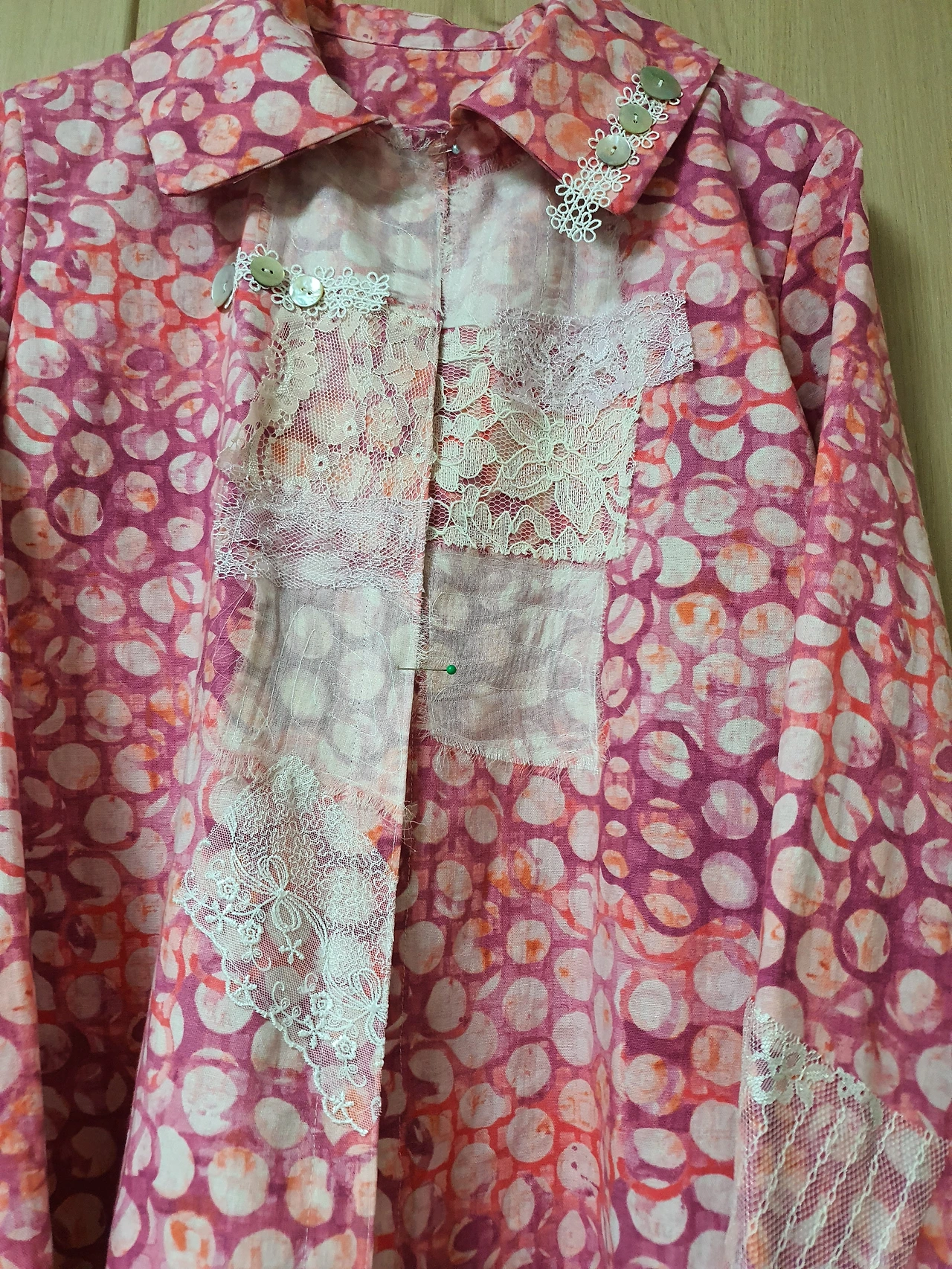 이번 재킷은 앞섶 쪽에 실크 조각이나 레이스 조각들을 붙이는 작업인 꼴라쥬를 먼저 하고 나서 만드는 작업이었다. 손이 많이 가고 시간이 걸리는 작업이지만 아기자기하면서 조금은 화려한 듯한 옷이 계절에 잘 어울릴 것 같기도 하고 친구 말에 의하면 안신영에게 가장 잘 어울린다는 것이다.