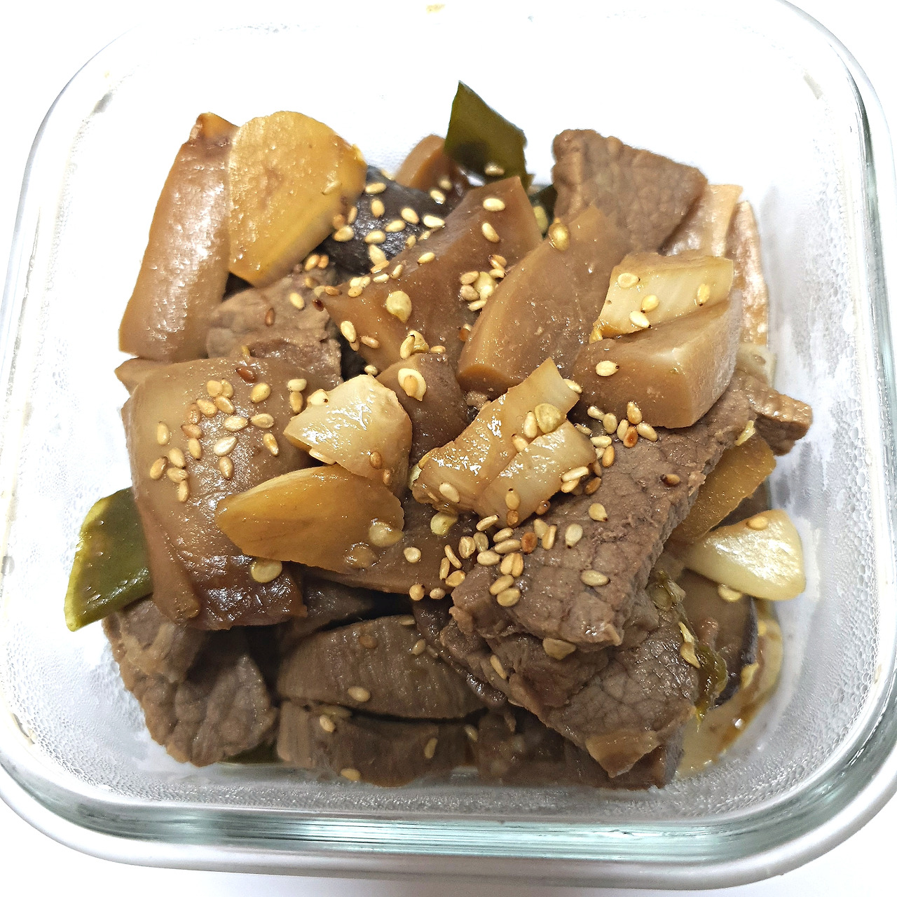 4. 우둔살과 버섯은 함께 넣어 잘박하게 끓인다. 물이 어느 정도 줄어들면 마늘과 청량초를 넣어 함께 졸인다.