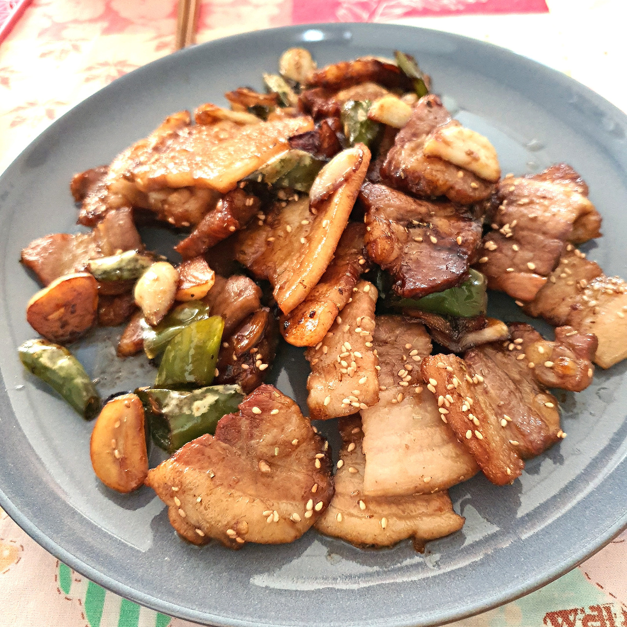 4, 삼겹살이 어느 정도 익었을 때 진간장과 와인 3큰술을 넣고 뚜껑을 덮는다. (와인이 없어서 매실청을 넣고 했는데 맛이 있었음). 혹시 대파가 있다면 큼직하게 썰어 팬 가장자리에 넣어 익히면 그 또한 맛이 기가 막힘.