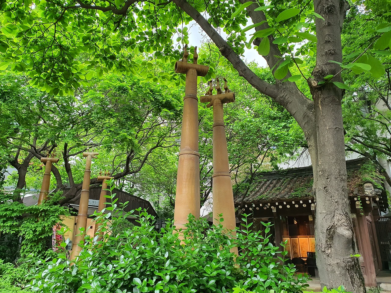솟대와 신록의 나무를 바라본다.