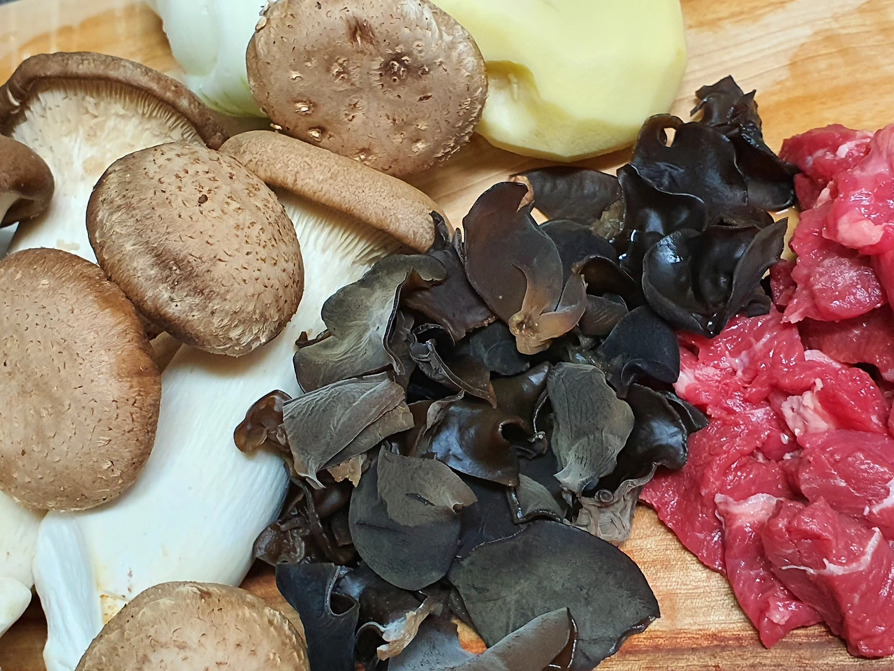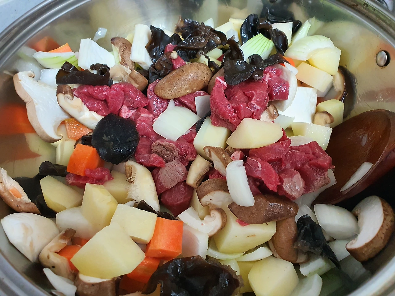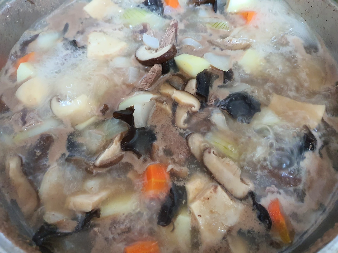 이번에는 기본 야채 양파, 감자 당근은 조금, 표고와 새송이버섯, 불린 목이버섯 이외에 쇠고기를 준비했는데, 평소에는 주로 돼지고기 전지를 사용할 때가 많다. 닭고기를 좋아하면 닭을 사다가 살코기를 발라내서 넣어도 맛이 좋다.