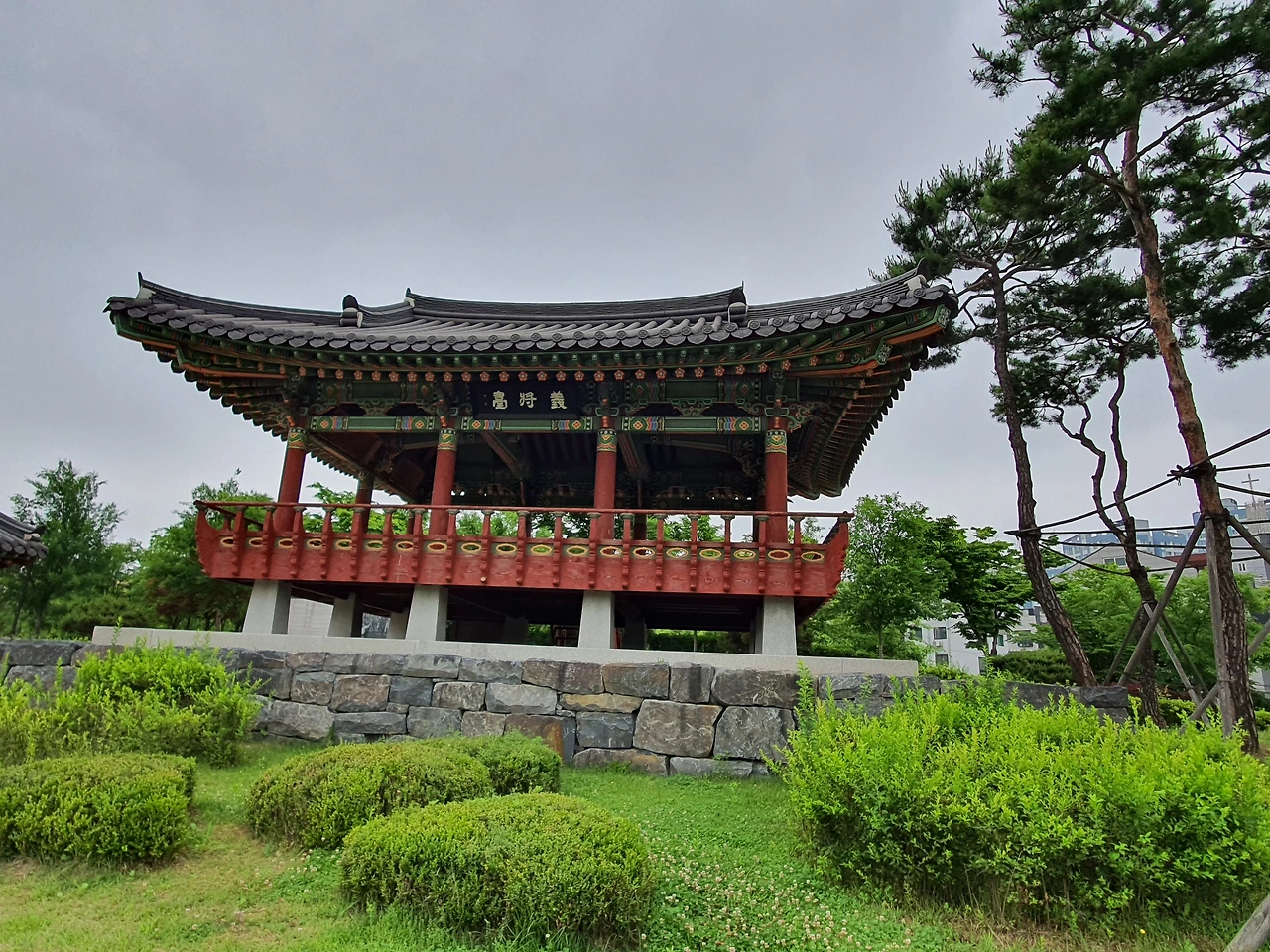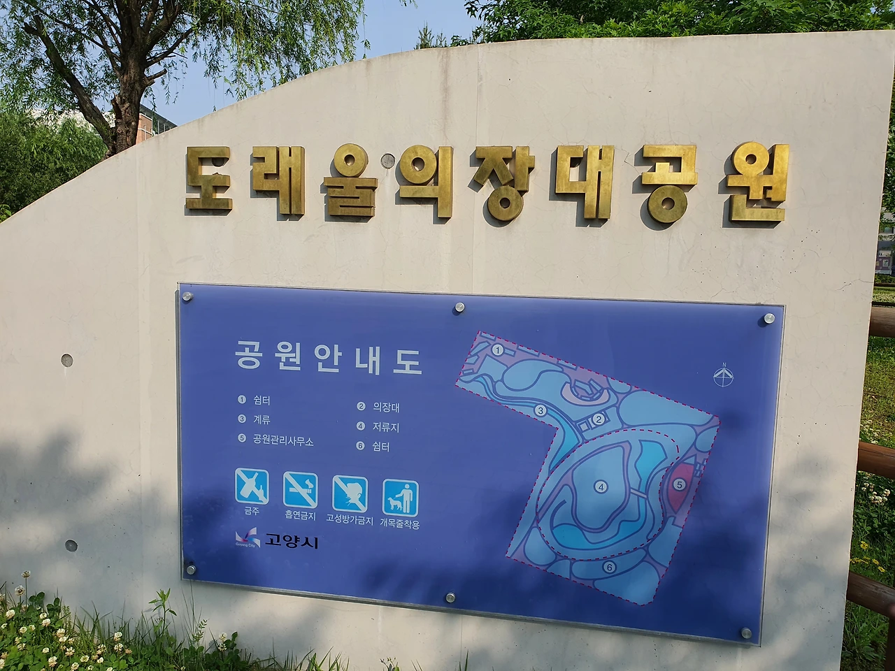 도래울 수변 공원을 걸으며 안쪽으로 기웃거려본다. 원흥 저류지에 둘레길을 만들어 놓아 몇몇 사람들이 조깅을 하고 산책하는 것이 보이면서 나무 사이에 무엇인가 있는 것처럼 보인다. 저류지 건너편에 누각이 보여 빙 둘러쳐진 둘레길을 따라가니[의장대 공원]이라는 표지석이 입구에 있다.
