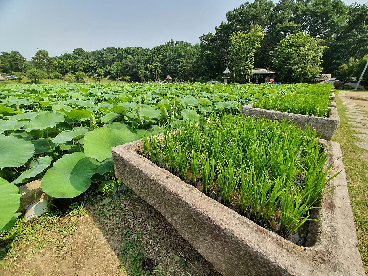 지난겨울, 봄에 텅 빈 하늘만 비추던 때와 다르게 연못에는 초록 초록한 연잎이 작은 우산을 펼쳐 든 것처럼 가득했다. 7월엔 연이 활짝 웃음 짓겠다. 연못 둘레에 돌확에 심어 놓은 벼들이 소담스레 자라 있었고 주인이 키우는 한 필의 말은 아주 맛나게 벼이삭을 뜯어먹고 있었다. 가족 단위로 손님이 많이 오는 곳이라 토끼우리와 닭들을 넣은 닭장도 눈높이에 있다.