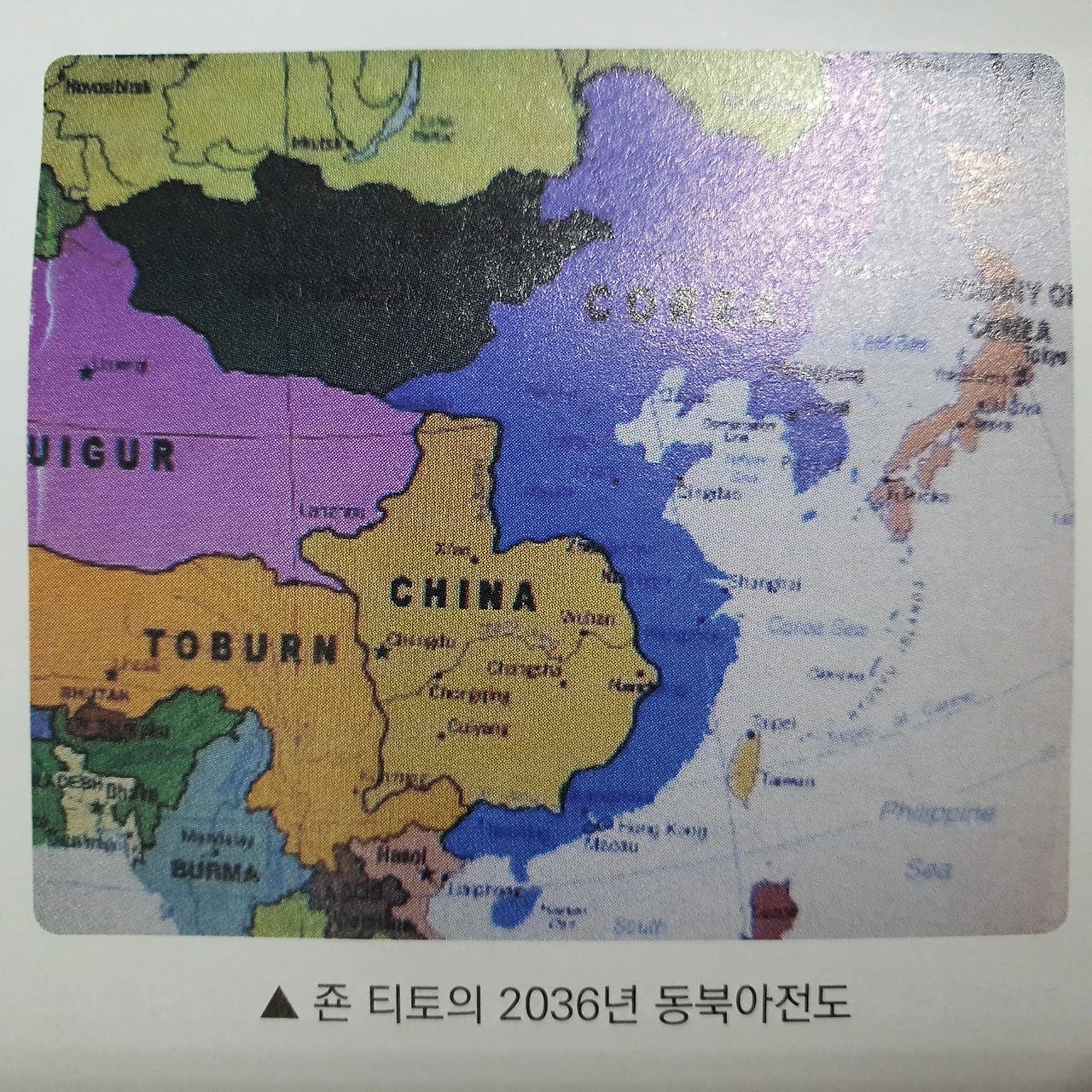 식사를 하러 와서 우리 땅 찾기를 하는 좋은 분의 사연을 알게 되었다. 식당 입구에서 매번 눈에 띈 간도 신문을 한 부 들고 나왔다. 장로님 말씀이 2036년 동북아 전도대로 되면 우리 후손들에게 얼마나 좋겠냐고 하셨는데 도무지 무슨 말씀을 하시는지 이해를 못했는데 신문을 들여다보니 미국의 예언가인 죤 티토의 동북아 전도를 보고 이해가 되었다. 원래 한(韓) 민족이 2천여 년간 동북아의 종주국으로 단군 조선이 통치한 영역을 다시 수복한다고 예언한 죤 티토의 얘기였다.