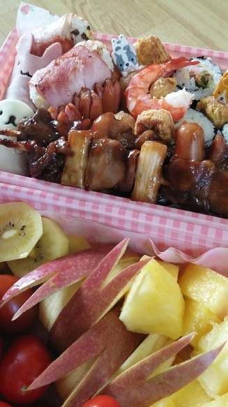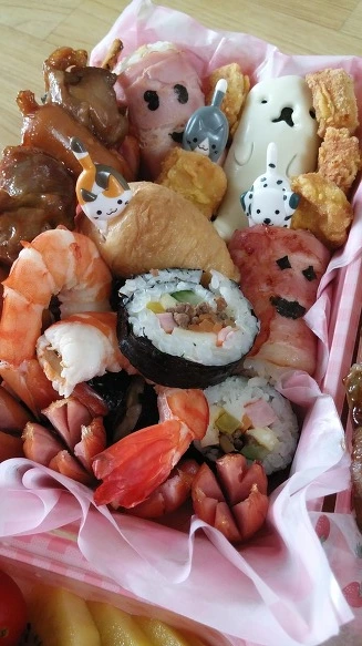 딸들이 어렸을 때는 온 가족이 김밥을 좋아해서 김을 세 묶음 이상을 만들었다. 그러니까 30~40개씩 김밥을 만들었다는 얘기다. 한 명이 소풍을 가면 그날 다른 딸들도 도시락은 당연히 김밥. 가족들은 시어른을 제외하고는 점심, 저녁 메뉴가 어묵탕과 김밥이었다. 김밥이 목이 멜까 봐 속재료를 10여 가지 넣는 것이 전통처럼 되어 있는 나만의 김밥. 그 외에 애들 좋아하는 새우튀김과 과일을 곁들여 넣어주어서 인기 있었던 소풍 도시락이다.