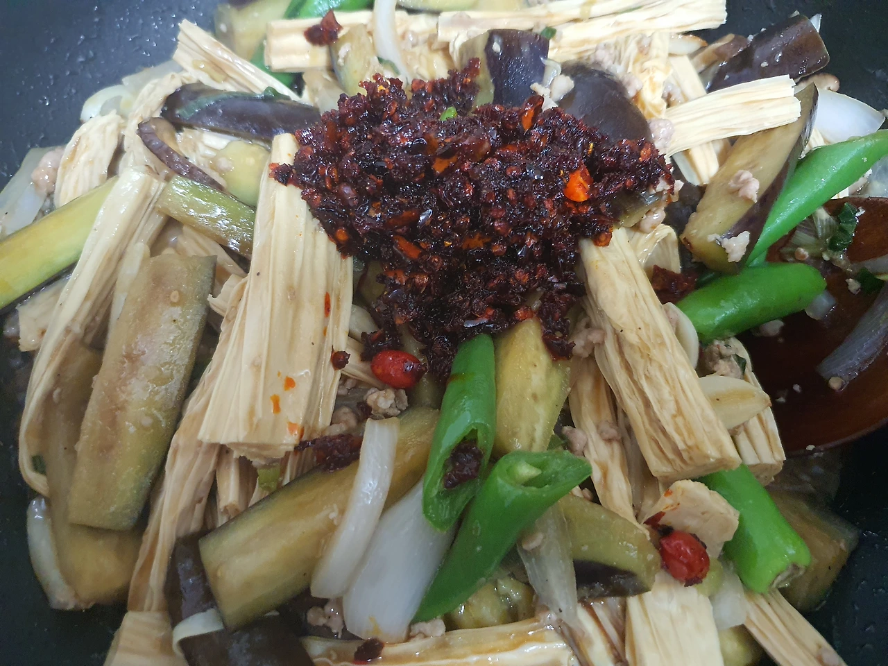 시골서 올라 온 가지를 얻어왔다며 주길래 "지난번처럼 볶아 먹자" 했더니 "그럼 푸조도 넣어야지" 했습니다.