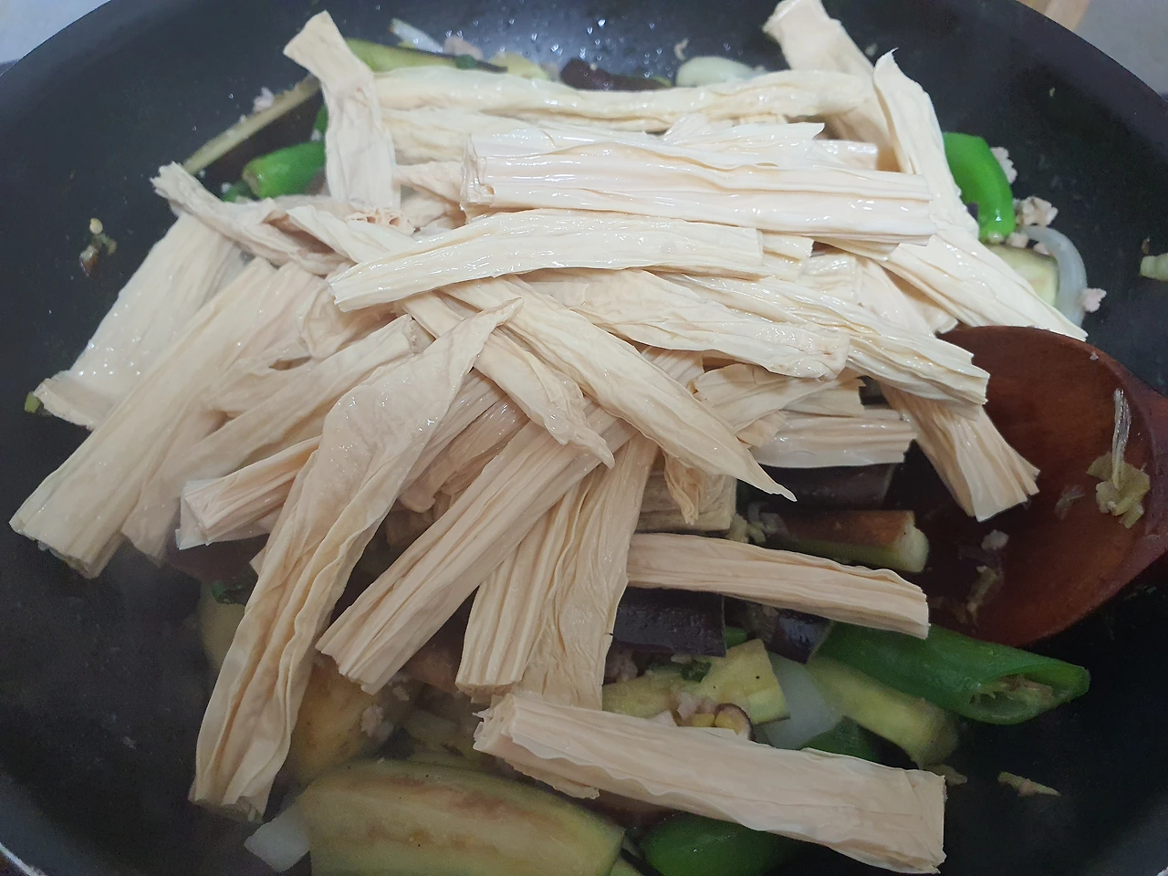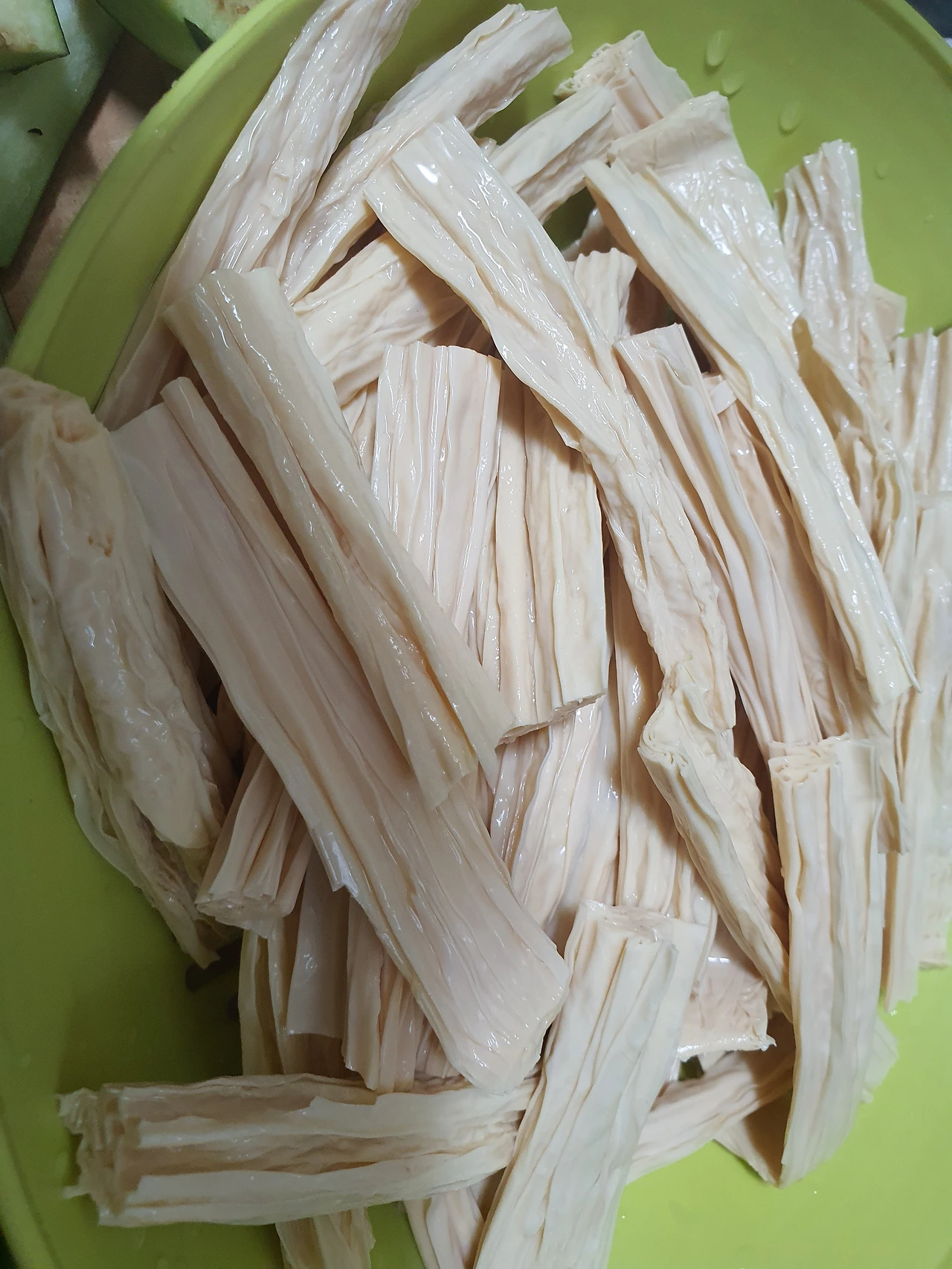 푸조는 건두부 종류인데 딸이 어젯밤에 물에 담가 놓았습니다. 불리면서 누렇게 된 물을 몇 번 갈아 줍니다.
