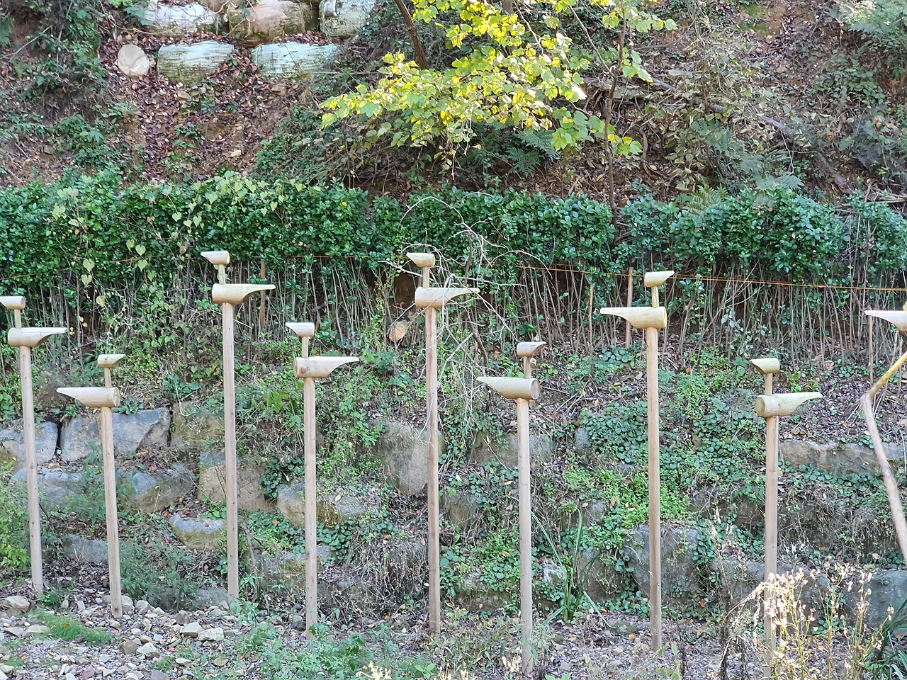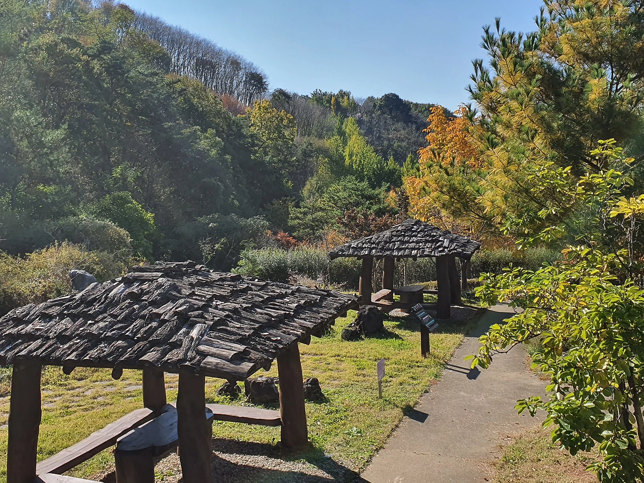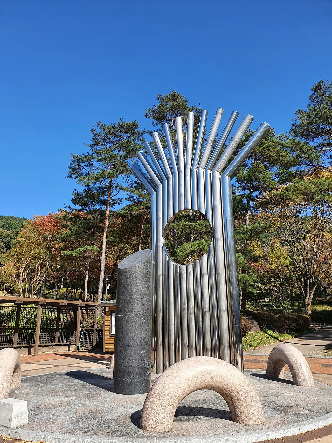 대가야 수목원 앞에는 대형 설치 미술 작품이 세워져 있다. 해설사의 설명을 들으니 우륵의 가야금을 형상화한 작품으로 12개의 파이프는 1년12달을, 앞의 기둥은 땅을 가운데 원형은 사람이 사는 우주 공간, 바닥의 도자기 반원형의 4개는 4계절을 의미한다고 한다고 한다.