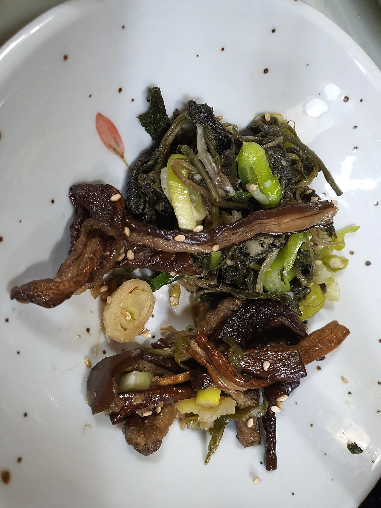 주인장은 쌀도 최고로 좋은 쌀로 지었다고 설명을 하면서 가지나물, 고추부각, 미역귀 튀각 등 자부심이 대단했다. 이 음식도 먹기에 바쁘기도 했지만 음식 사진 찍는 것이 익숙지 않아서 먹음직스러운 반찬 사진을 찍지 못한 것이 아쉽다. 식사 도중에 몇 개 찍어 보았다.