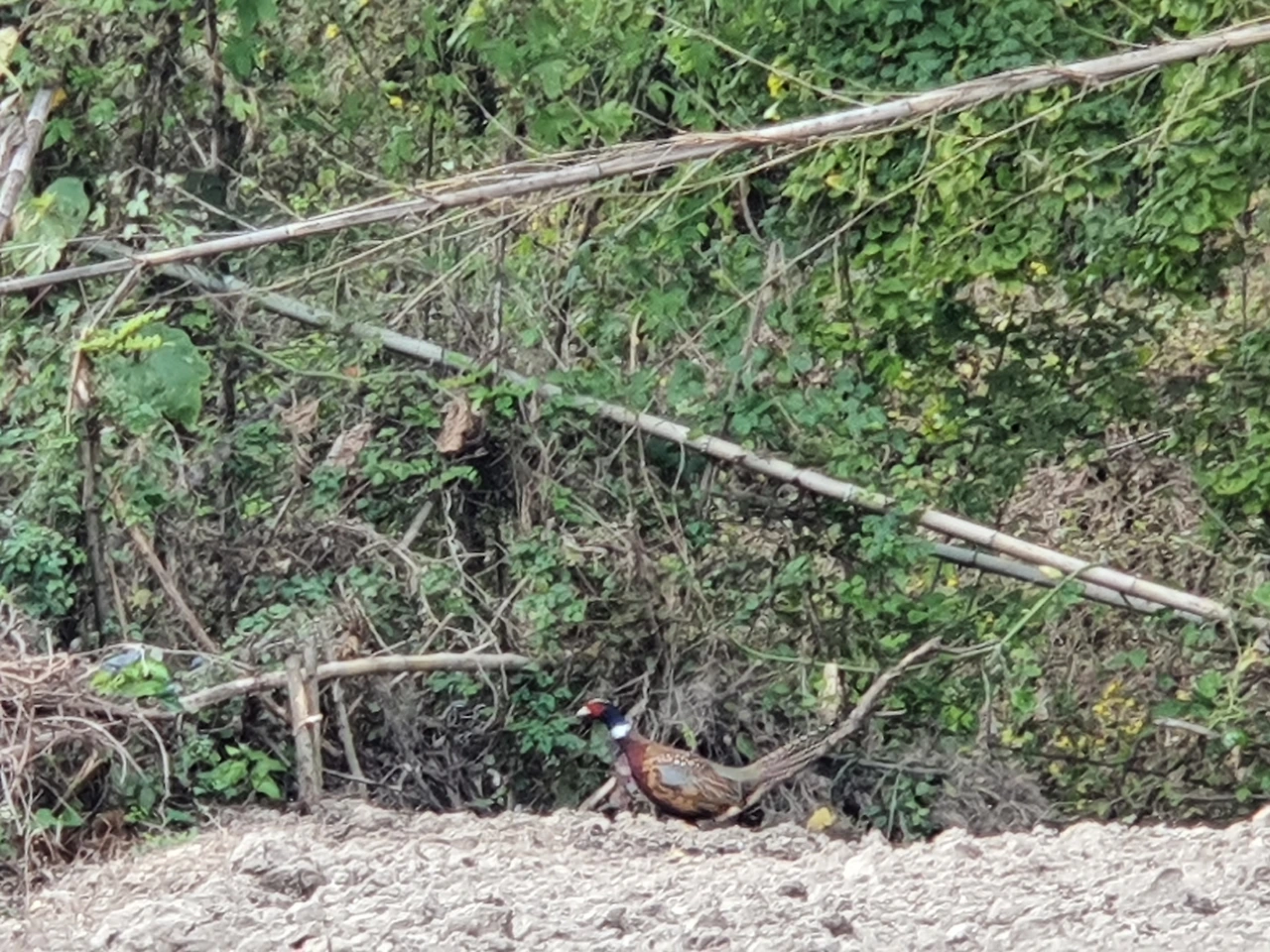 고샅길을 걸으며 어렸을 적 돌아다녔던 동네 골목이 생각나서 마음이 푸근하다. 꿩 두 마리가 소리도 요란하게 홰를 치며 푸드덕 거리며 날아드는 것을 목격하면서 놀란 가슴이 두 방망이질한다. 이토록 가까운 곳에서 장끼와 까투리를 본 적이 없는데 그 둘은 몸을 서로 부대끼면서 우람한 은행나무 위에 미끄러지듯 앉으려다가 밭으로 떨어진 뒤에 덤불숲으로 까투리 먼저 숨고 장끼가 나중에 까투리 따라 가버렸다. 장끼 사진은 한 장 건졌다.