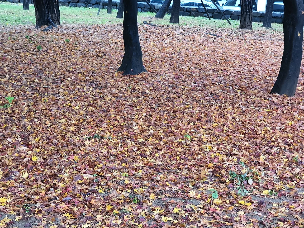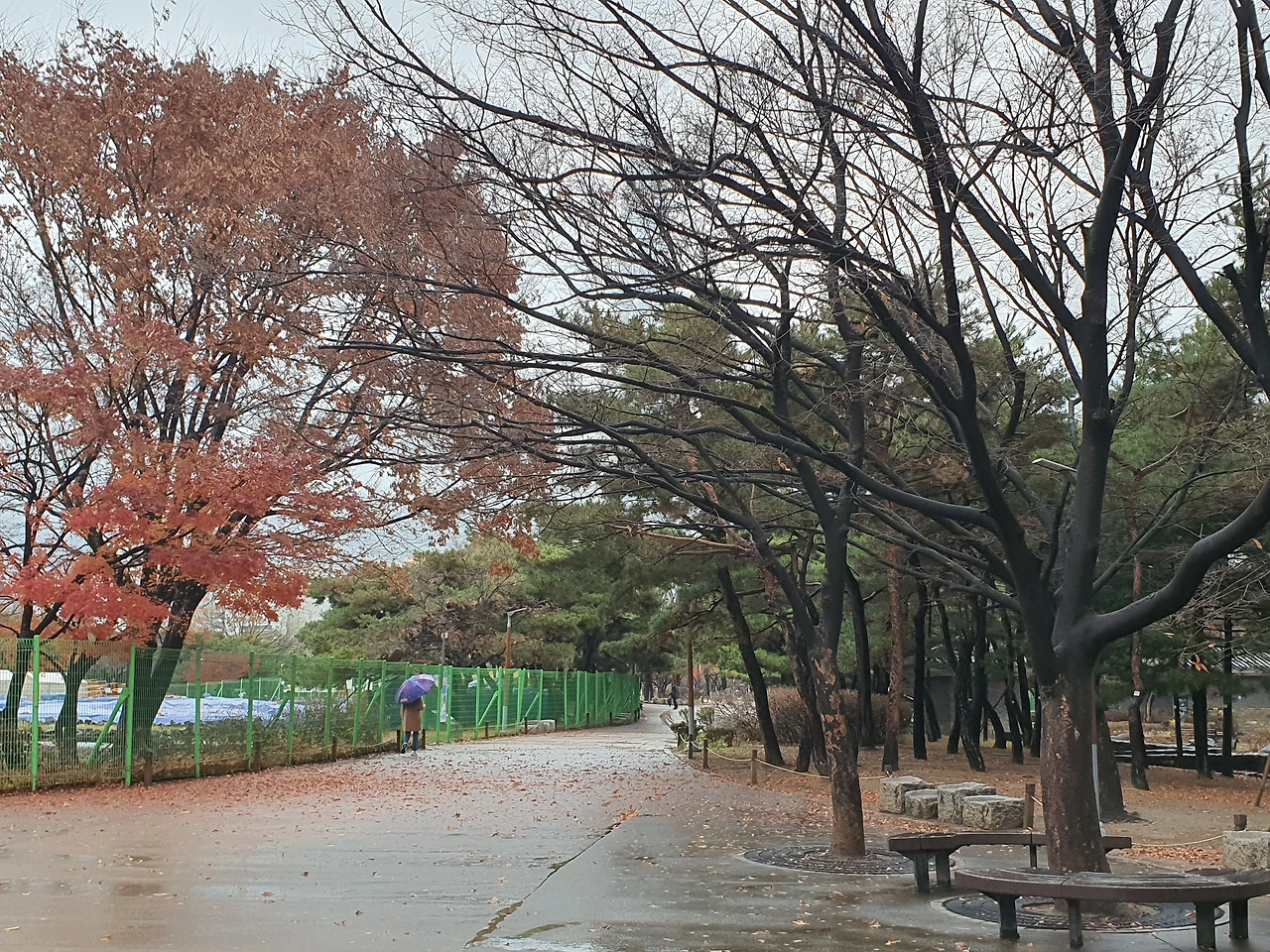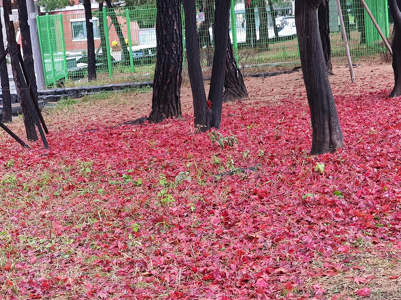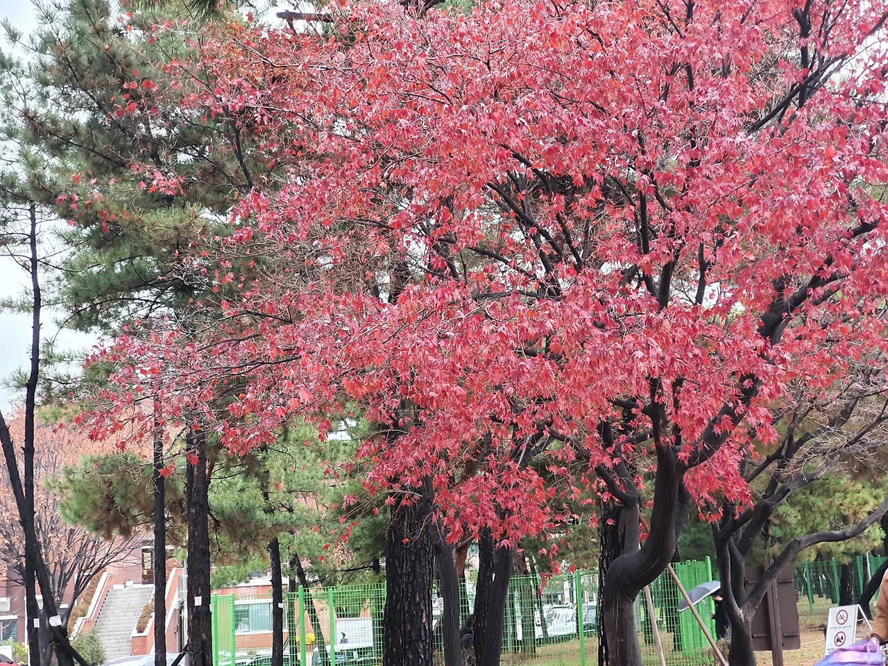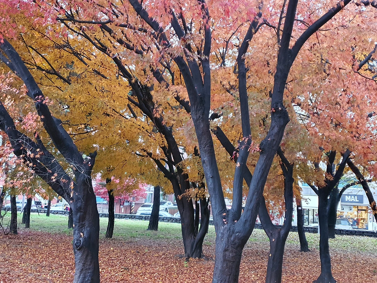 소나무들이 세월의 풍상을 담은 듯이 줄지어 서 있고, 단풍나무는 더욱 빨갛게 날씨와 대조를 이루고 있다. 장대비를 맞고 많은 나뭇잎을 떨구고 섰는 나무들은 비워 낼 것은 비워야 함을 보여준다. 앞으로 올 계절을 준비하는 듯 보인다.