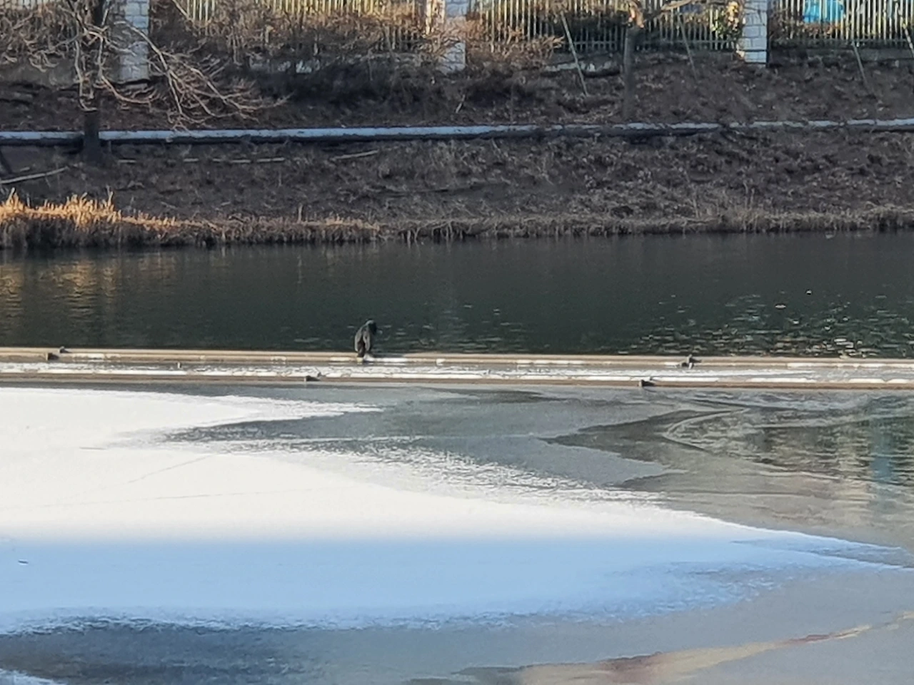 호수를 덮은 얼음은 눈이 하얗게 쌓여 있다. 중간쯤에 흐르는 호수 물 위에는 오리 몇 마리 헤엄치며 논다. 날다가 비행기가 이륙을 하듯 미끄러지며 착지를 하는 오리를 가마우지 두 마리가 멀찍이 앉아 구경하고 있다.