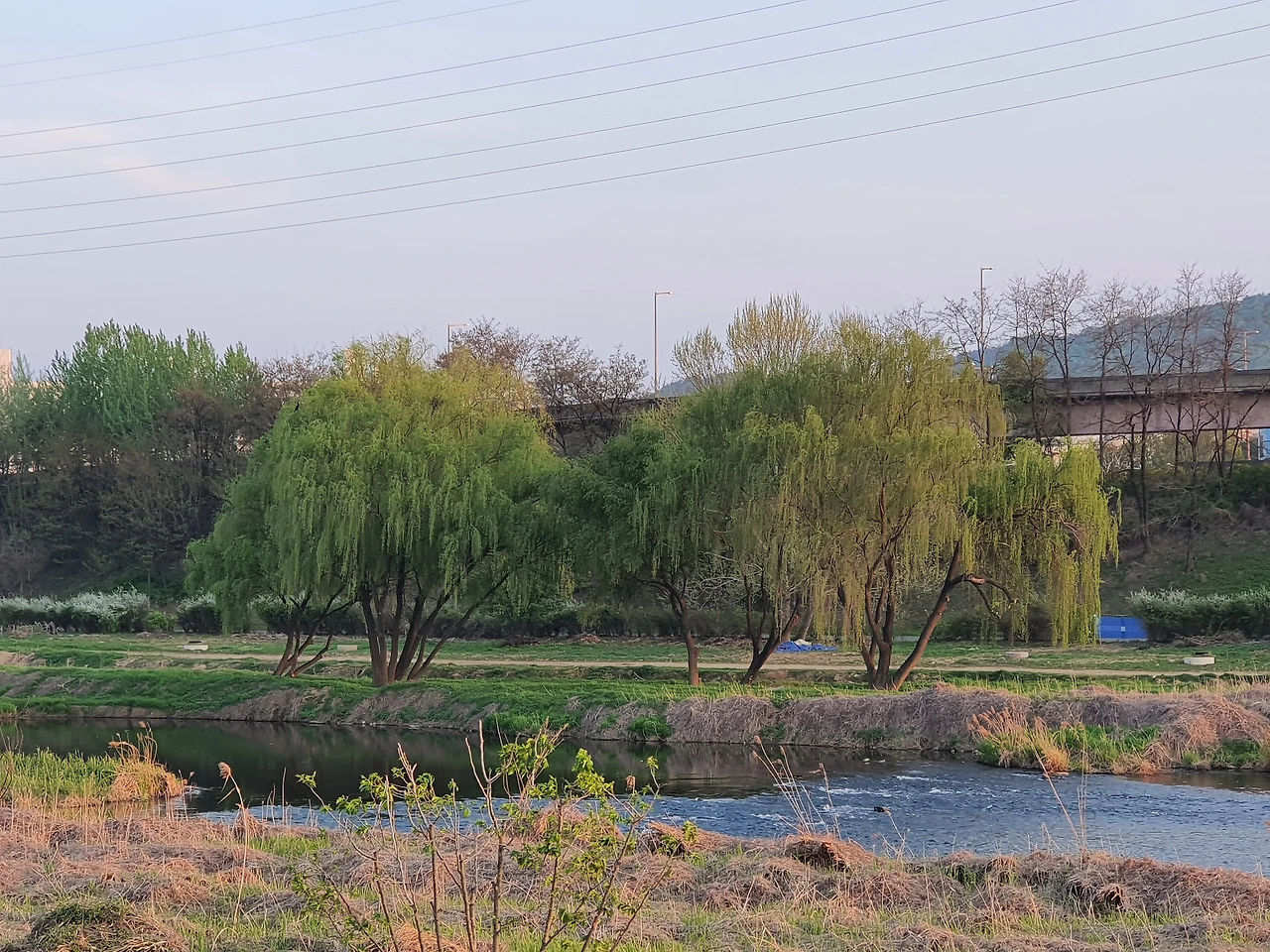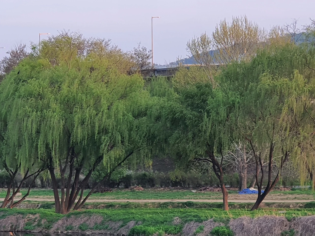 강가의 버드나무 시원한 초록물들인 가지마다