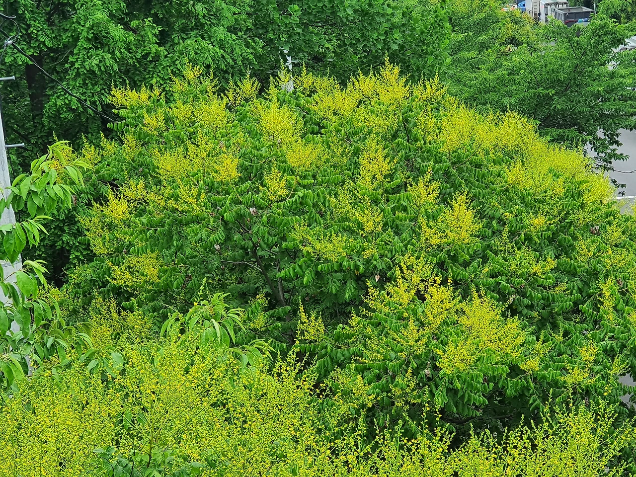모감주 나무 꽃이 피어난다. 숲길.