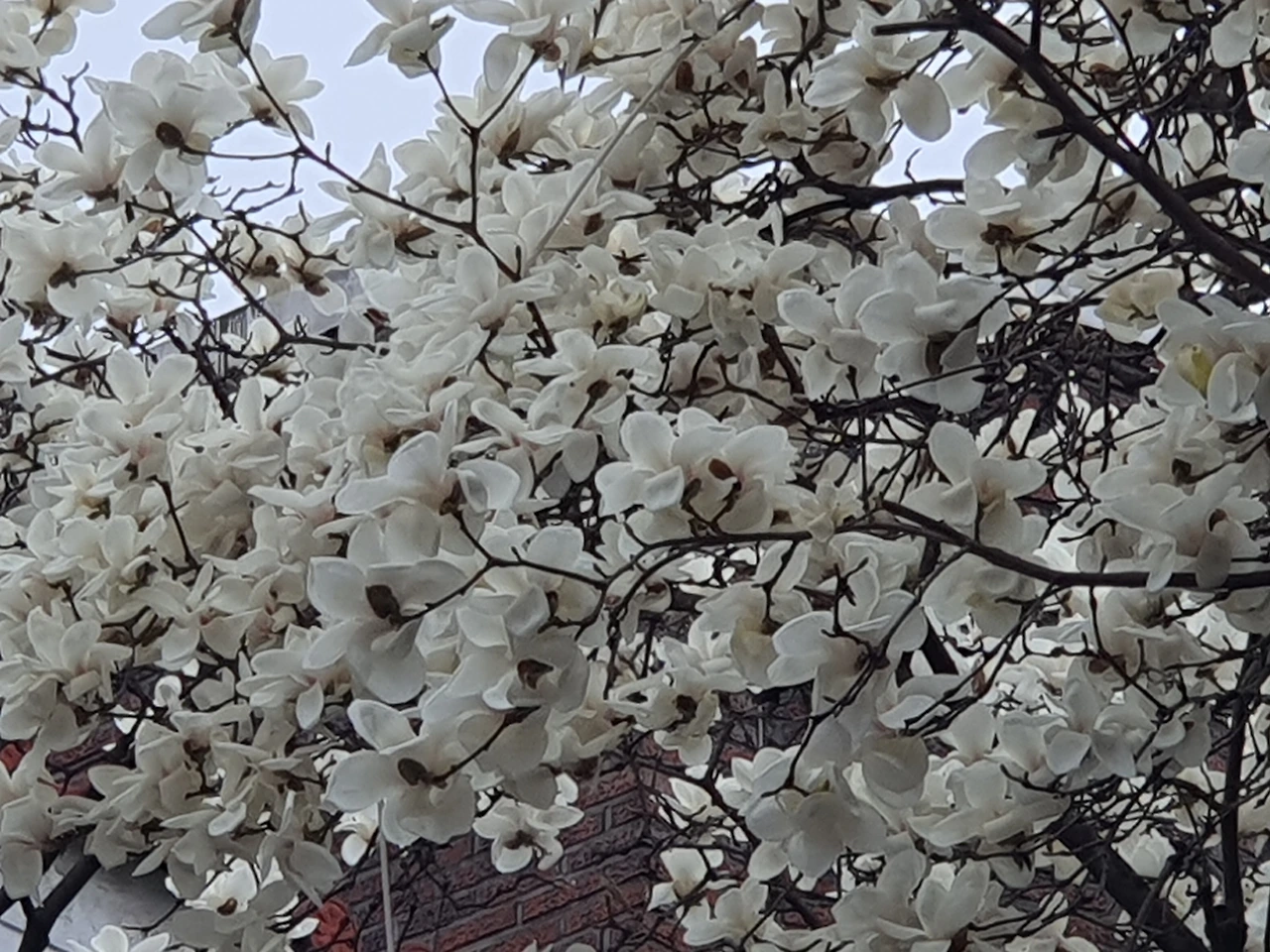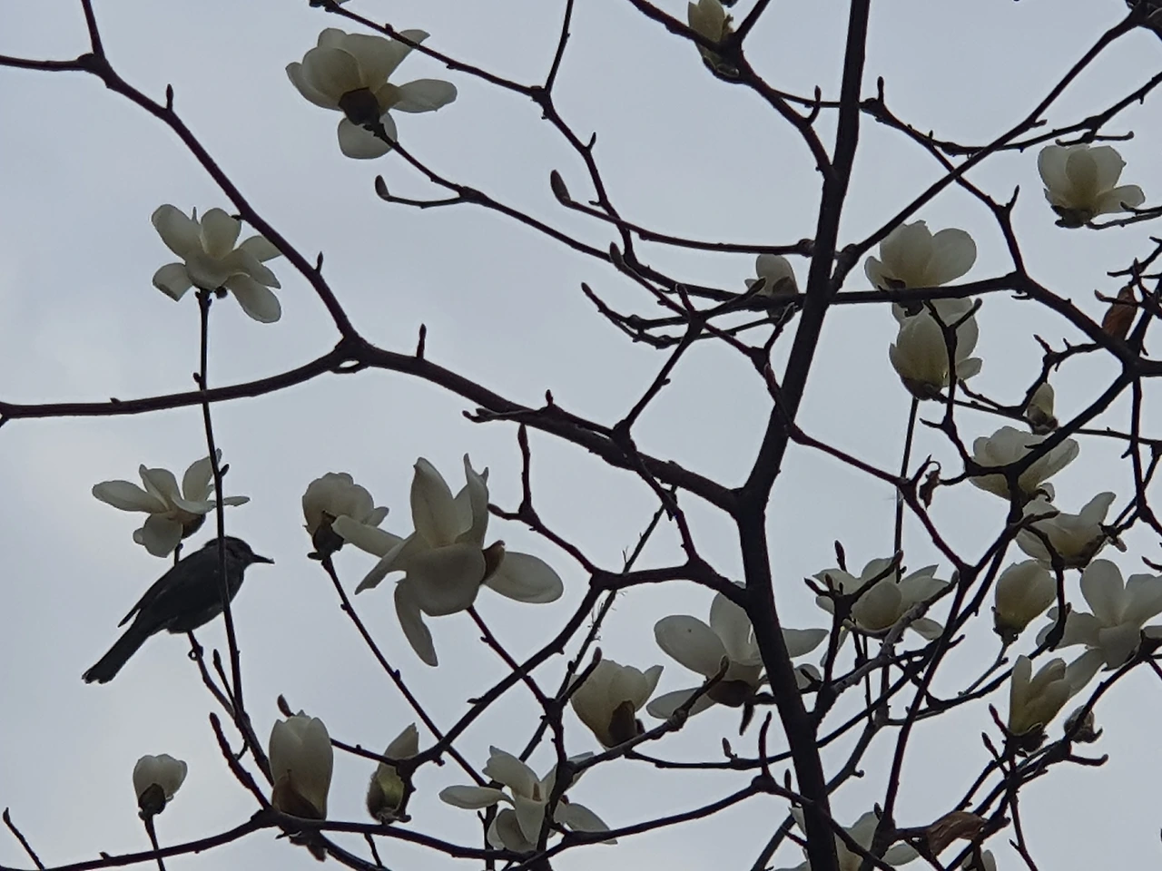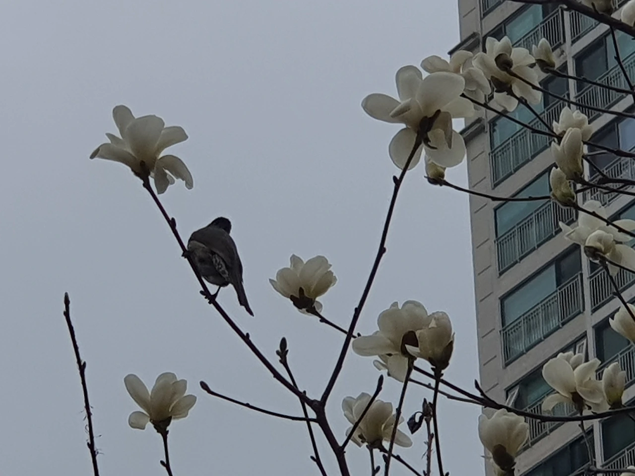 목련나무의 새들은 꽃잎을 쪼아 먹는다고 열중해서 나무 밑에서 사진을 찍어도 날아가지 않는다.