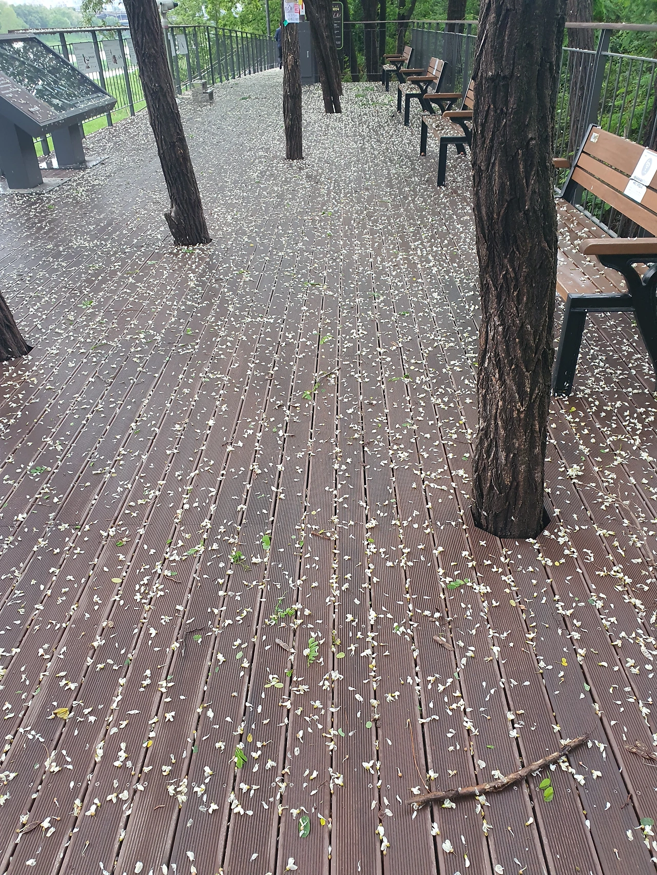 무수한 꽃이 떨어져 데크길을 아름답게 수를 놓아