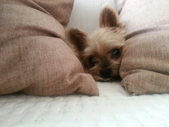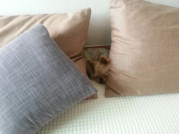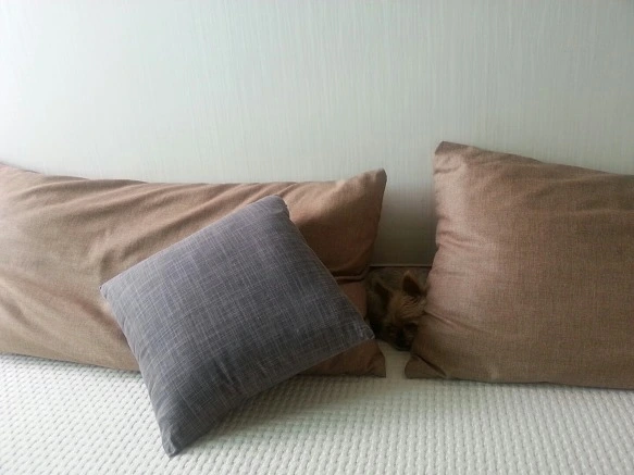 마치 숨바꼭질하듯 쿠션 사이에서 숨듯이 자다 깨서는 왜 깨웠어? 하는 표정 너무 귀엽다.