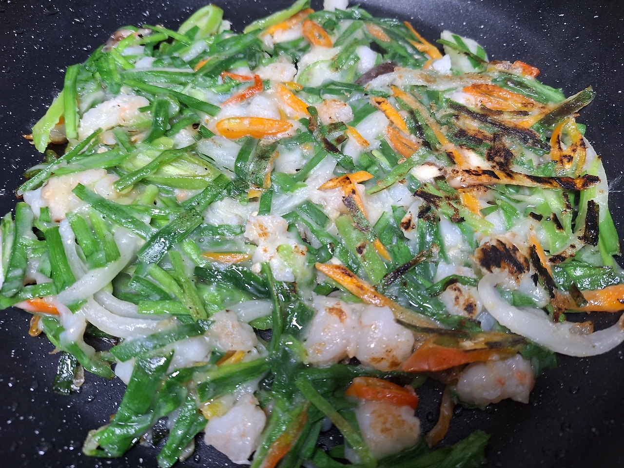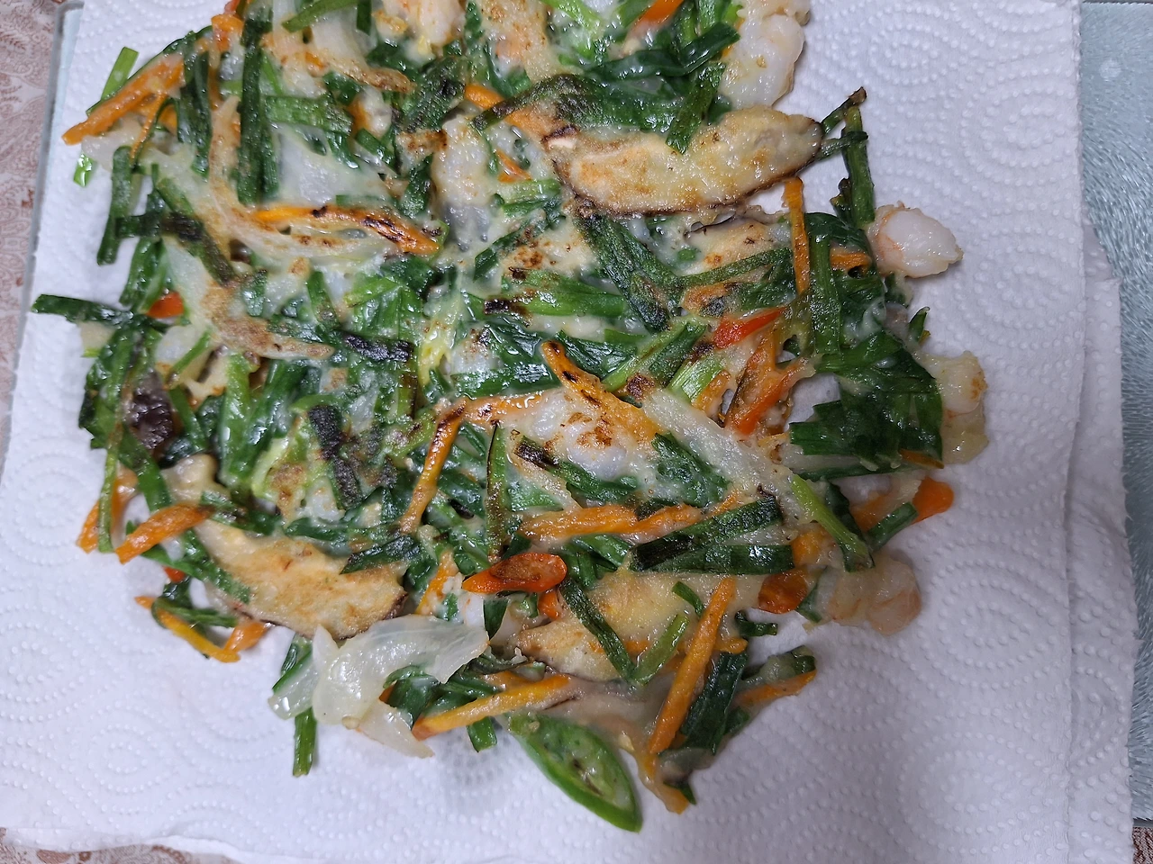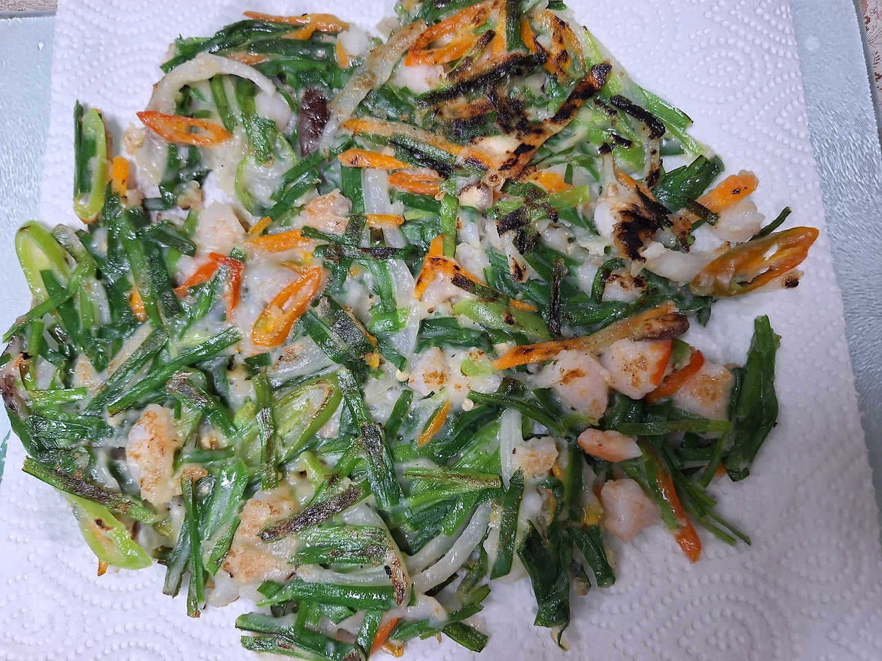 이후로 비록 진통 소염제이지만 그 약을 먹고 무릎의 통증도 완화되었고, 이젠 근무지의 그 많은 계단도 잘 오르내린다. 근무지 특성상 매일 보통 2만보에 가까운 걸음을 걷는다. 퇴근 때마다 발바닥부터 통증이 시작되고 가끔 무릎도 삐걱대지만 그 약의 효과를 보고 있음이 분명하다. 하루에 두 번 먹으라는 약을 한번 먹고도 괜찮다면서 모아 놓은 약을 나에게 주라고 친구에게 전해주는 동네 언니도 고맙고 친구에게도 뭔가 보답을 해야 하는데 그동안 자잘하게 했던 선물 말고 특별한 것이 없을까 생각하다 만든 부추전.
