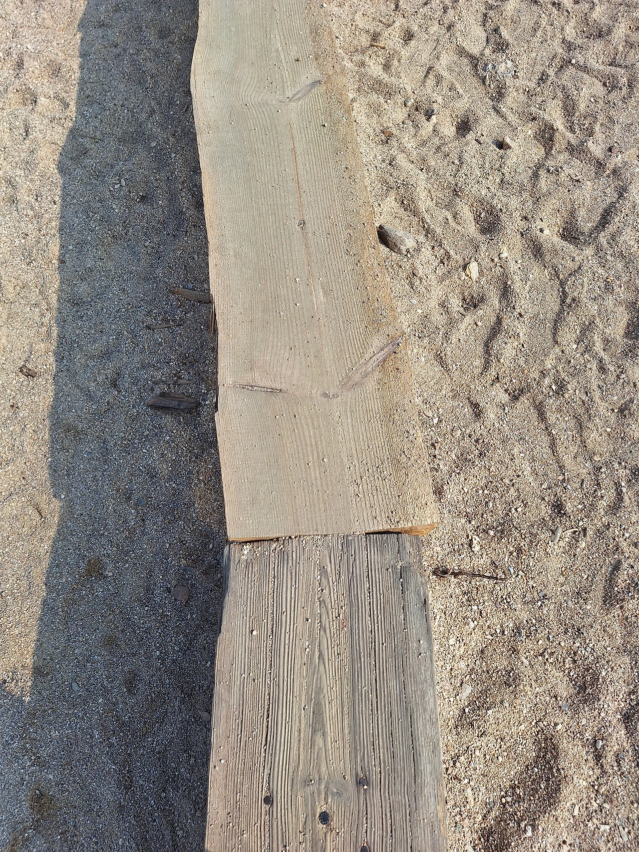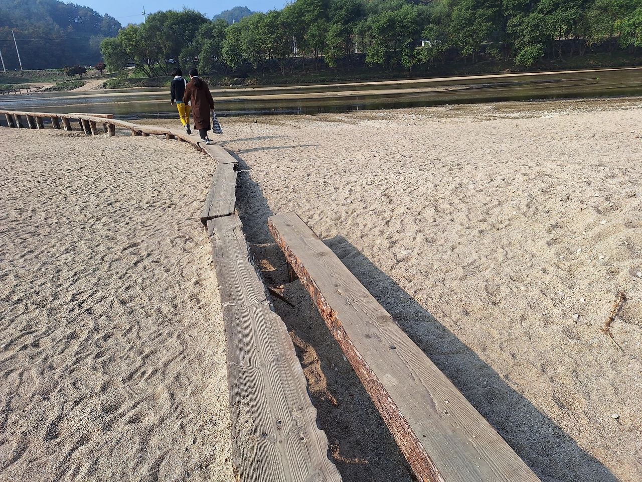 그러고 보니 중간중간 외나무다리 옆에 2미터 정도 길이의 보조 다리를 세워 놓아 마주쳤을 때 비켜서 있도록 해놓은 다리다. 모래사장 위로 있는 다리를 걸어갈 때는 떨어져도 안전하다 생각되어 걷는 것이 재미롭다. 하지만 강물이 점점 깊어지는 곳에 다다르니 조금 겁이 난다. 발을 헛디딜까 봐 바닥을 보면서 걸어 어지러운데 강물이 깊은 곳에서는 물살이 세어 다리에서 떨어질까 봐 무섭고 현기증이 났다.