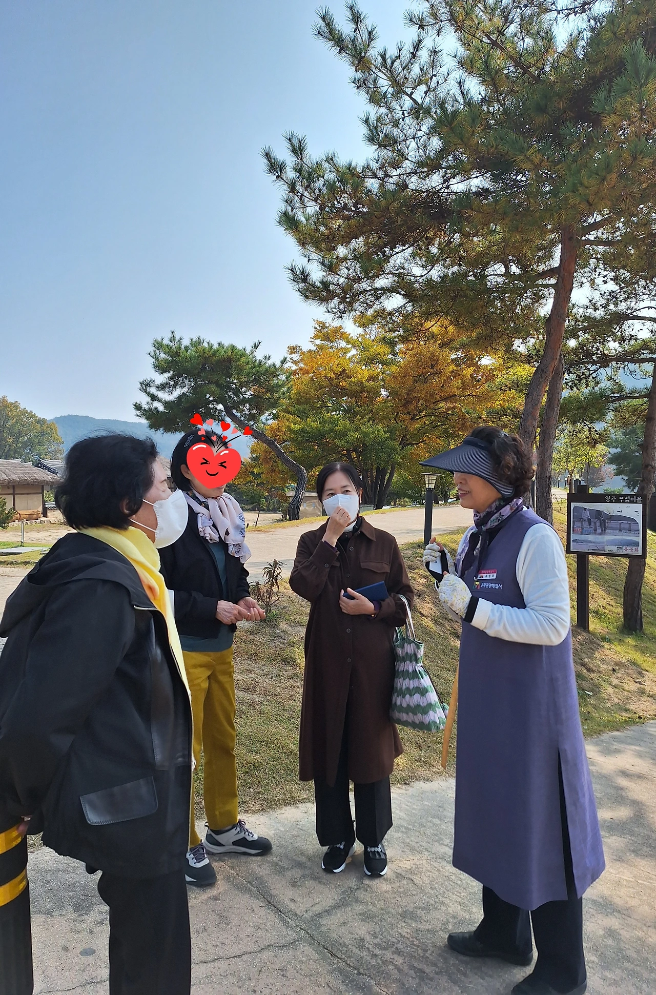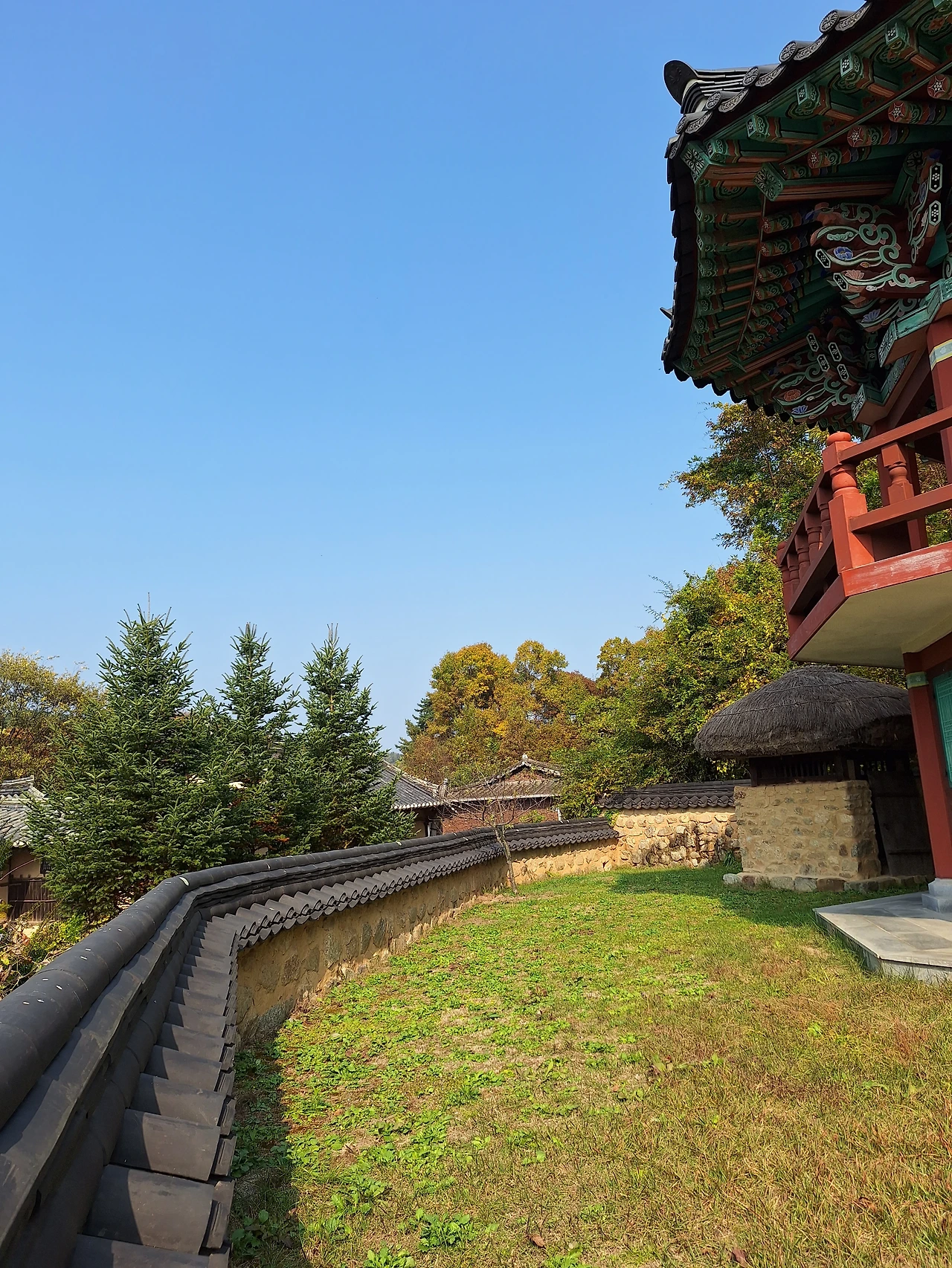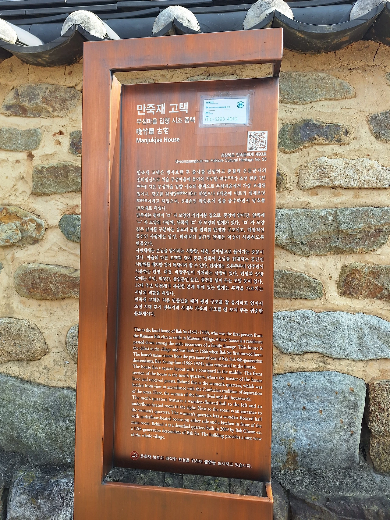 전통가옥이 많고 조선시대 후기의 전형적인 사대부 가옥으로 문화재도 많다면서 한 번씩 둘러보라고 하여 돌담을 따라 마을의 고샅길을 걸으며 빨간 감나무와 고택이 어찌나 잘 어울리는지 탄성을 자아내며 감탄을 한다. 곳곳에 들꽃 같은 추억의 꽃들을 만나 반가워 고택 사잇길을 하염없이 걷고 싶다. 김규진가옥(金圭鎭家屋), 김위진가옥(金渭鎭家屋), 해우당고택(海遇堂古宅), 만죽재고택(晩竹齋古宅) 등을 찾아 고택 앞에 서서 아름다운 기와집을 음미해 본다.