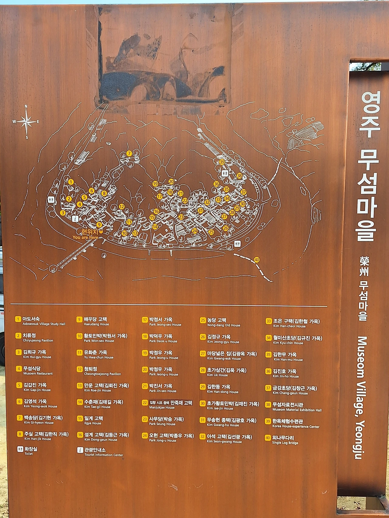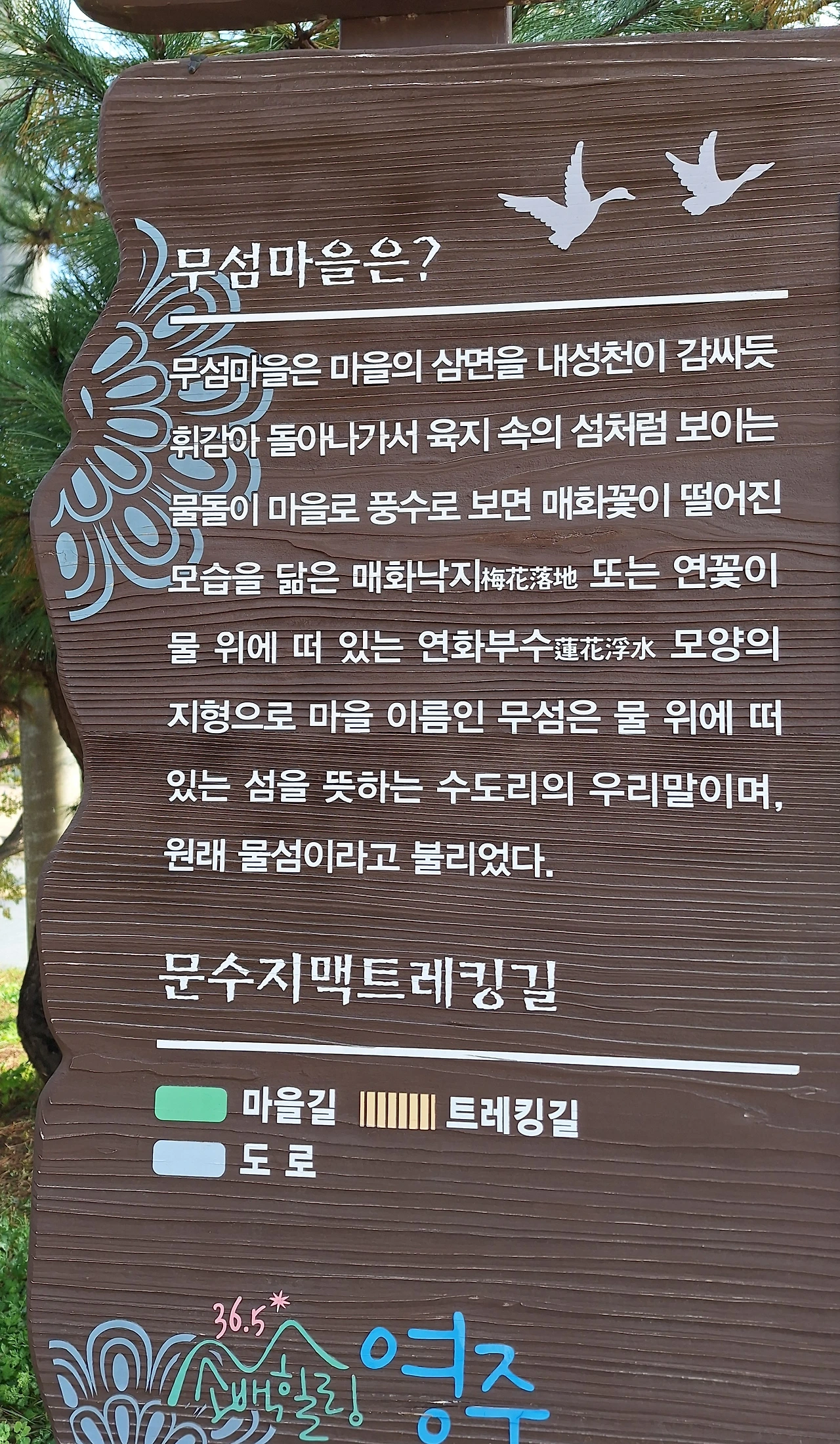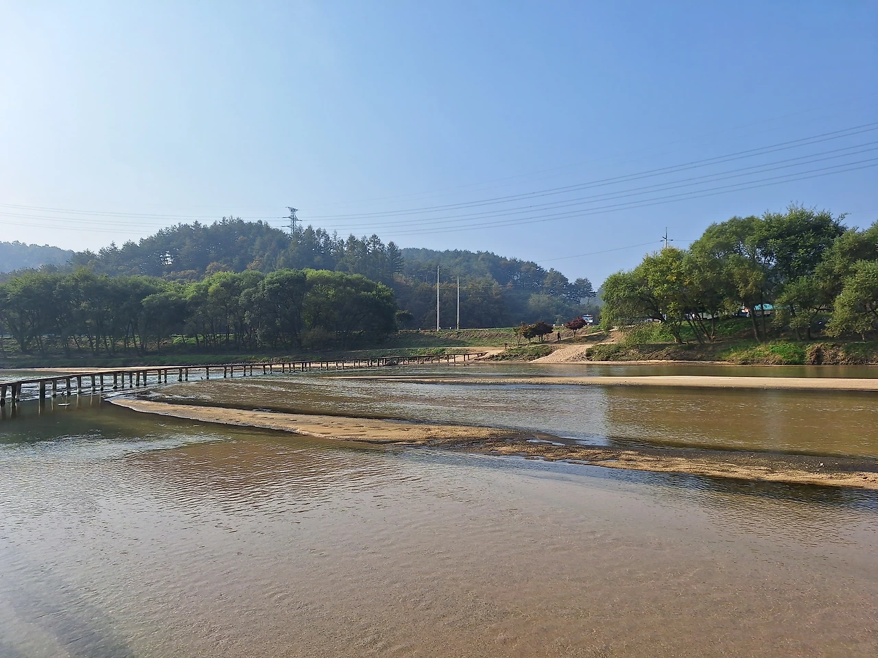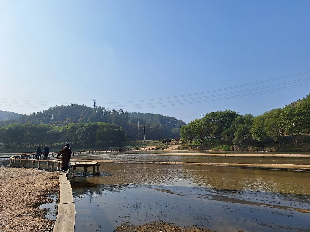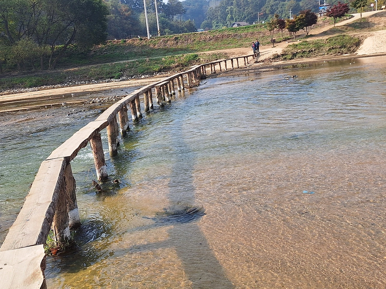 왜 무섬 마을인지 사전 지식이 없는 채로 도착해서 멀리 바라 보이는 외나무다리를 보고서야 언젠가 티브이에서 보았던 나무다리가 무섬다리이며 홍수에 유실된 다리 일부분은 새로이 만들어 보완했다는 것이 떠올랐다.